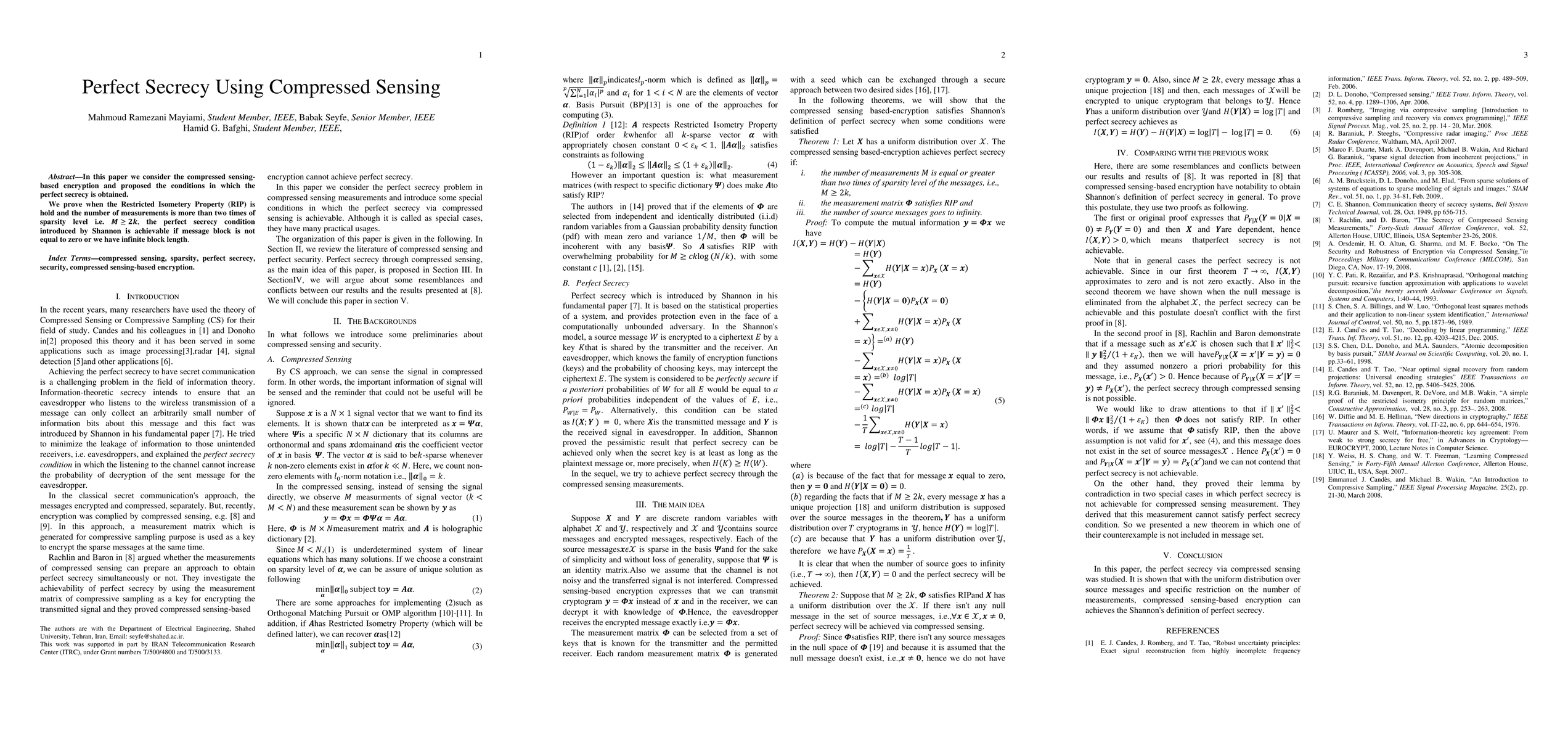 Researchers propose conditions for achieving perfect secrecy using compressed sensing, where a minimum of two times the sparsity level requires more than 2k measurements. Perfect secrecy is achievable if message blocks are not zero or have infinite length.