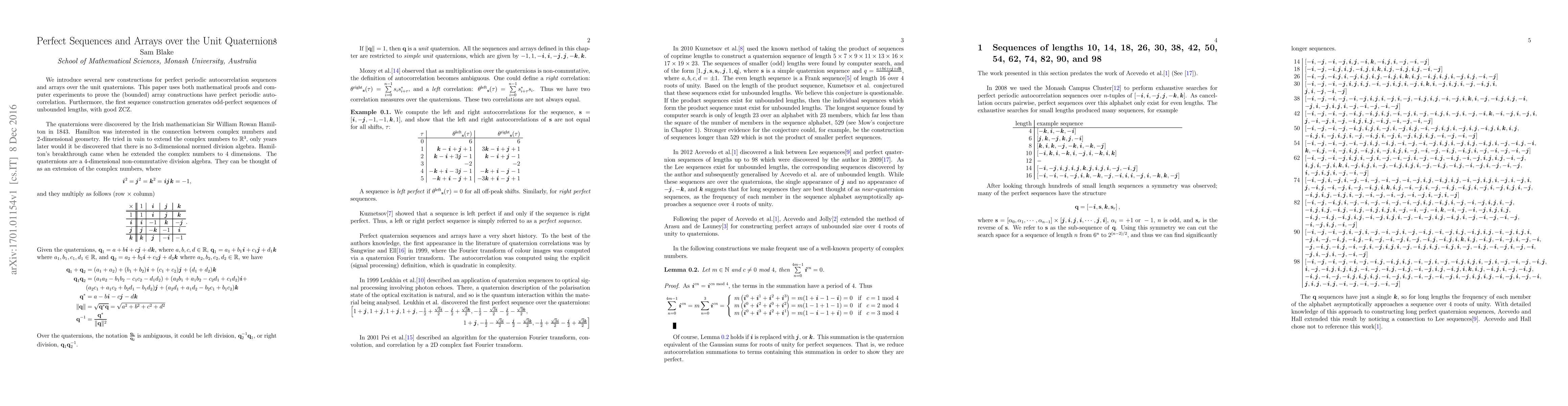 This paper presents new constructions for perfect periodic autocorrelation sequences and arrays based on unit quaternions, validated through mathematical proofs and computer experiments, and introduces the first odd-perfect sequence of unbounded length with good ZCZ properties.