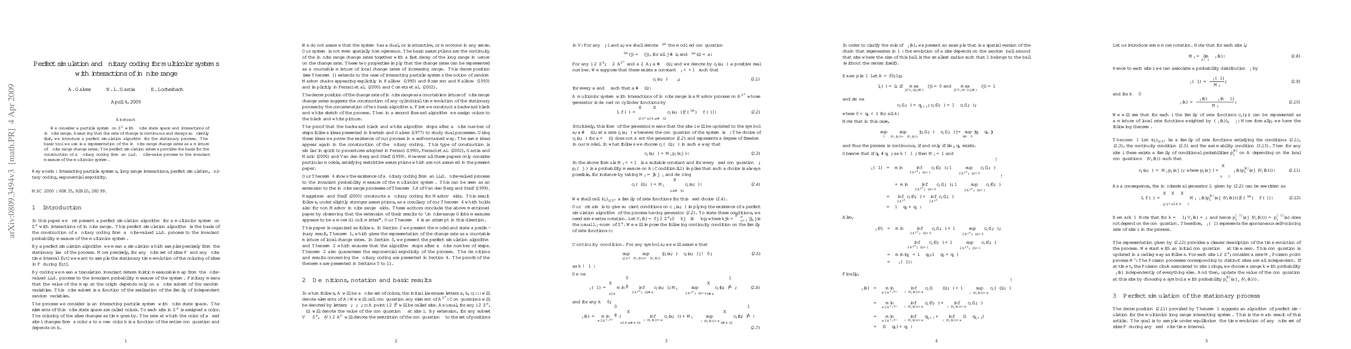 Summary: The paper presents a perfect simulation algorithm for a particle system with infinite range interactions on $Z^d$, utilizing a finitary coding approach based on independent uniform random variables. The method ensures exponential ergodicity by representing infinite range change rates as mixtures of finite range change rates.