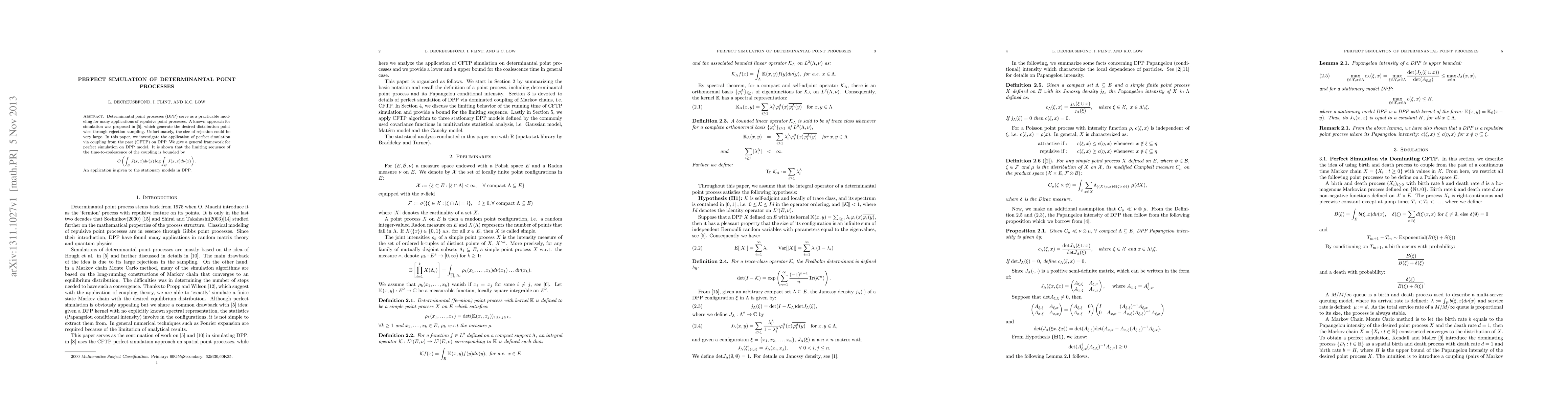 This paper proposes a perfect simulation method for determinantal point processes (DPP) using coupling from the past (CFTP), offering an efficient alternative to the traditional rejection sampling approach. The method ensures exact sampling and provides a bounded time complexity for the time-to-coalescence, enhancing the practical application of DPP models.