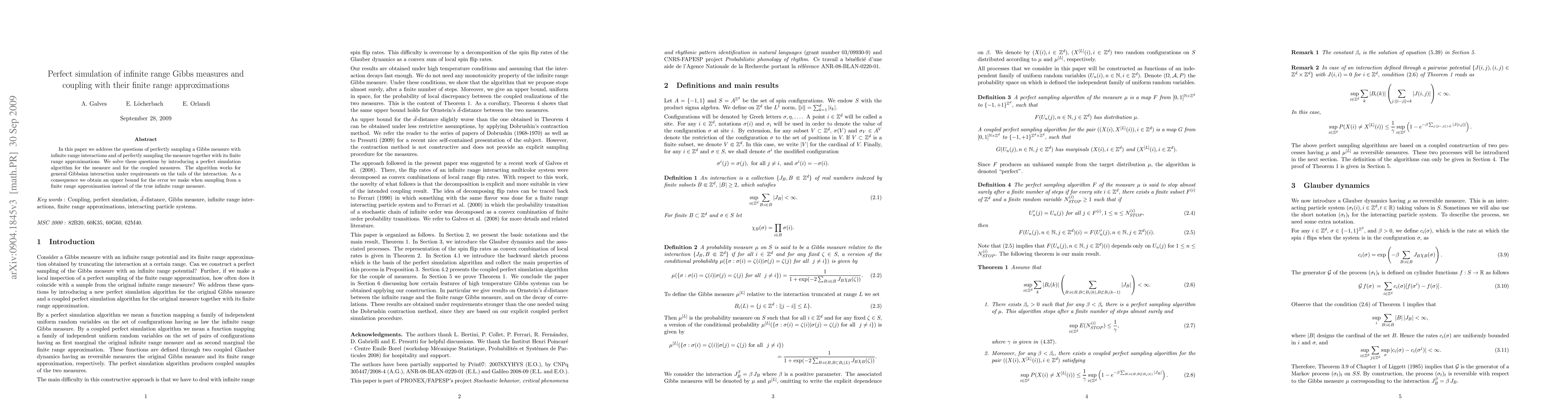 In this paper we address the questions of perfectly sampling a Gibbs measure with infinite range interactions and of perfectly sampling the measure together with its finite range approximations. We solve these questions by introducing a perfect simulation algorithm for the measure and for the coupled measures. The algorithm works for general Gibbsian interaction under requirements on the tails of the interaction. As a consequence we obtain an upper bound for the error we make when sampling from a finite range approximation instead of the true infinite range measure.
