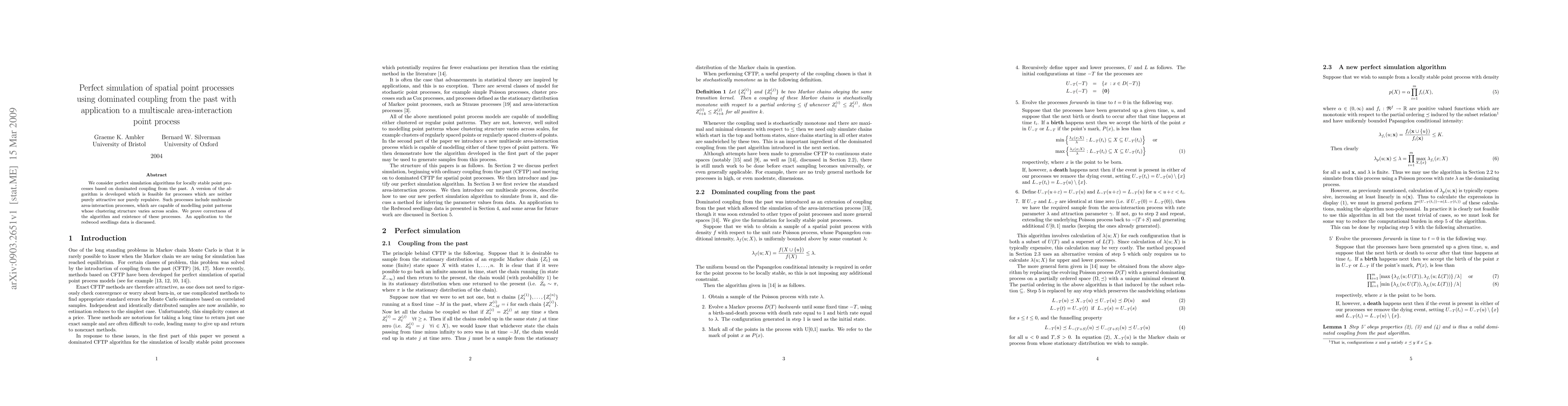 This paper develops a perfect simulation algorithm for locally stable point processes using dominated coupling from the past, applicable to multiscale area-interaction processes. The algorithm is proven correct and demonstrated with an application to redwood seedlings data.