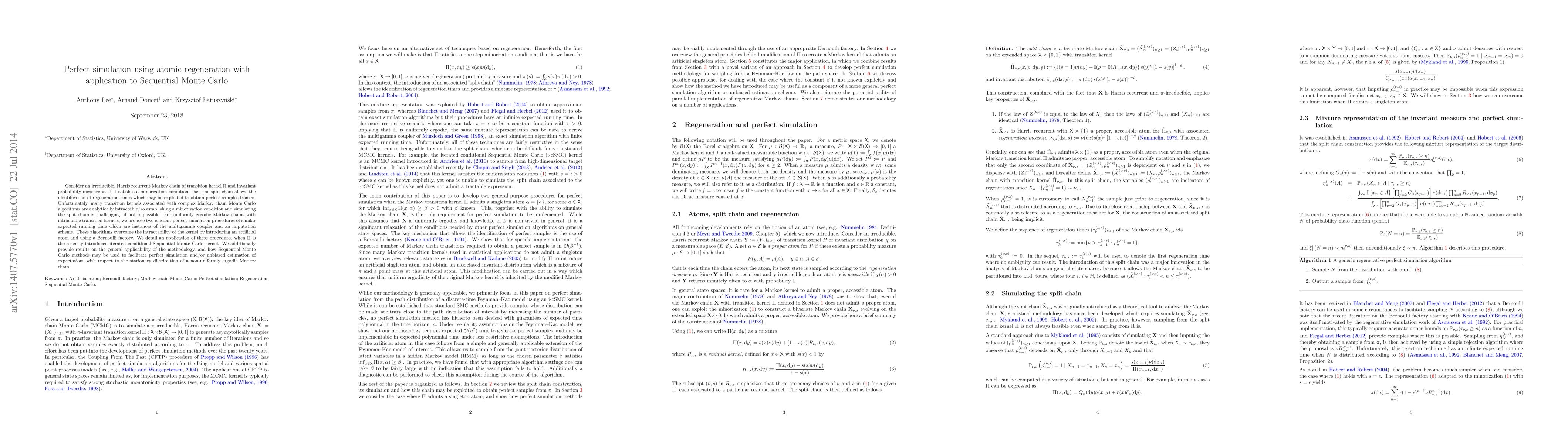 The paper proposes perfect simulation procedures for Markov chain Monte Carlo algorithms using atomic regeneration, specifically targeting intractable transition kernels. It introduces an artificial atom and employs a Bernoulli factory to overcome intractability, applicable to uniformly ergodic Markov chains.