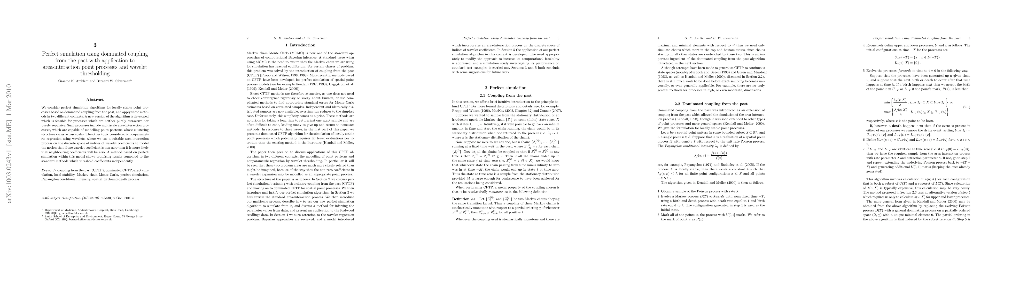 This paper develops a perfect simulation algorithm using dominated coupling from the past for locally stable point processes, applicable to multiscale area-interaction processes and wavelet thresholding in nonparametric regression. The method shows better performance than standard independent thresholding techniques.