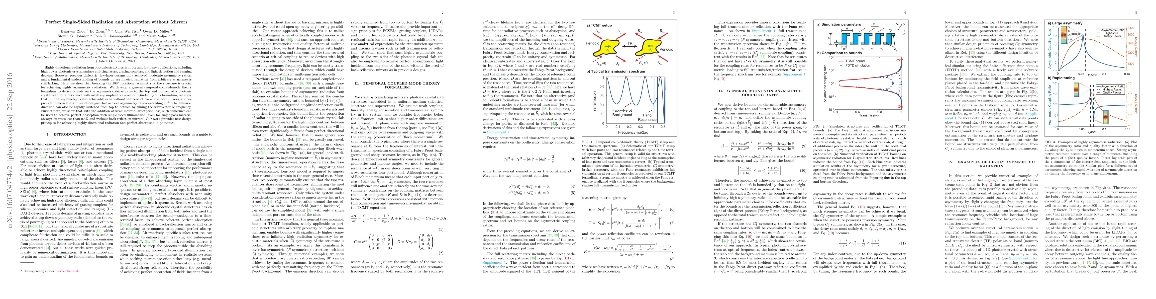 Highly directional radiation from photonic structures is important for many applications, including high power photonic crystal surface emitting lasers, grating couplers, and light detection and ranging devices. However, previous dielectric, few-layer designs only achieved moderate asymmetry ratios, and a fundamental understanding of bounds on asymmetric radiation from arbitrary structures is still lacking. Here, we show that breaking the 180$^\circ$ rotational symmetry of the structure is crucial for achieving highly asymmetric radiation. We develop a general temporal coupled-mode theory formalism to derive bounds on the asymmetric decay rates to the top and bottom of a photonic crystal slab for a resonance with arbitrary in-plane wavevector. Guided by this formalism, we show that infinite asymmetry is still achievable even without the need of back-reflection mirrors, and we provide numerical examples of designs that achieve asymmetry ratios exceeding $10^4$. The emission direction can also be rapidly switched from top to bottom by tuning the wavevector or frequency. Furthermore, we show that with the addition of weak material absorption loss, such structures can be used to achieve perfect absorption with single-sided illumination, even for single-pass absorption rates less than $0.5\%$ and without back-reflection mirrors. Our work provides new design principles for achieving highly directional radiation and perfect absorption in photonics.