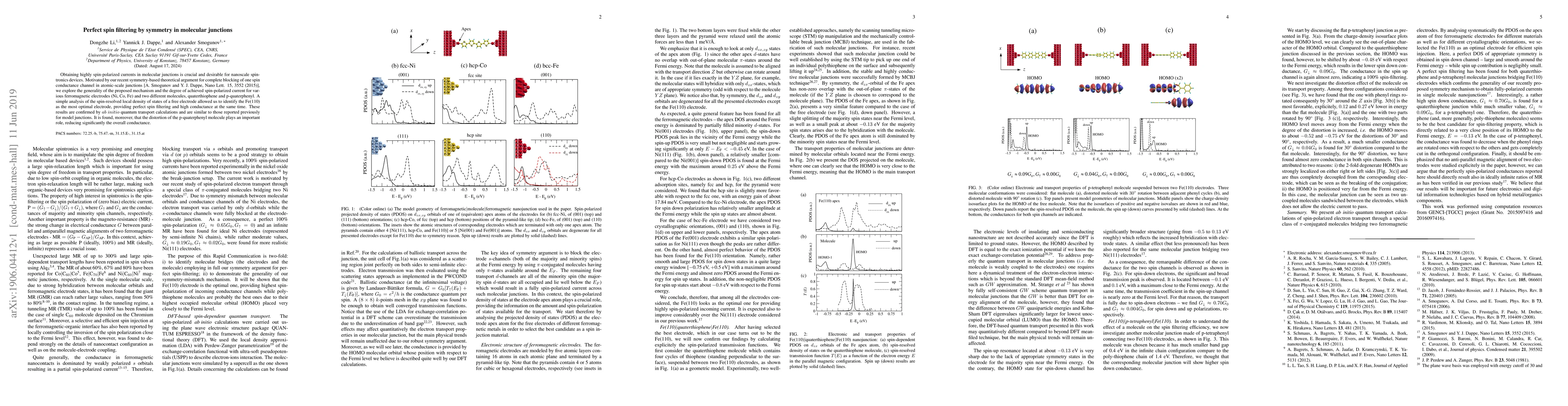 Obtaining highly spin-polarized currents in molecular junctions is crucial and desirable for nanoscale spintronics devices. Motivated by our recent symmetry-based theoretical argument for complete blocking of one spin conductance channel in atomic-scale junctions [A. Smogunov and Y. J. Dappe, Nano Lett. 15, 3552 (2015)], we explore the generality of the proposed mechanism and the degree of achieved spin-polarized current for various ferromagnetic electrodes (Ni, Co, Fe) and two different molecules, quaterthiophene and p-quaterphenyl. A simple analysis of the spin-resolved local density of states of a free electrode allowed us to identify the Fe(110) as the most optimal electrode, providing perfect spin filtering and high conductance at the same time. These results are confirmed by $ab$ $initio$ quantum transport calculations and are similar to those reported previously for model junctions. It is found, moreover, that the distortion of the p-quaterphenyl molecule plays an important role, reducing significantly the overall conductance.