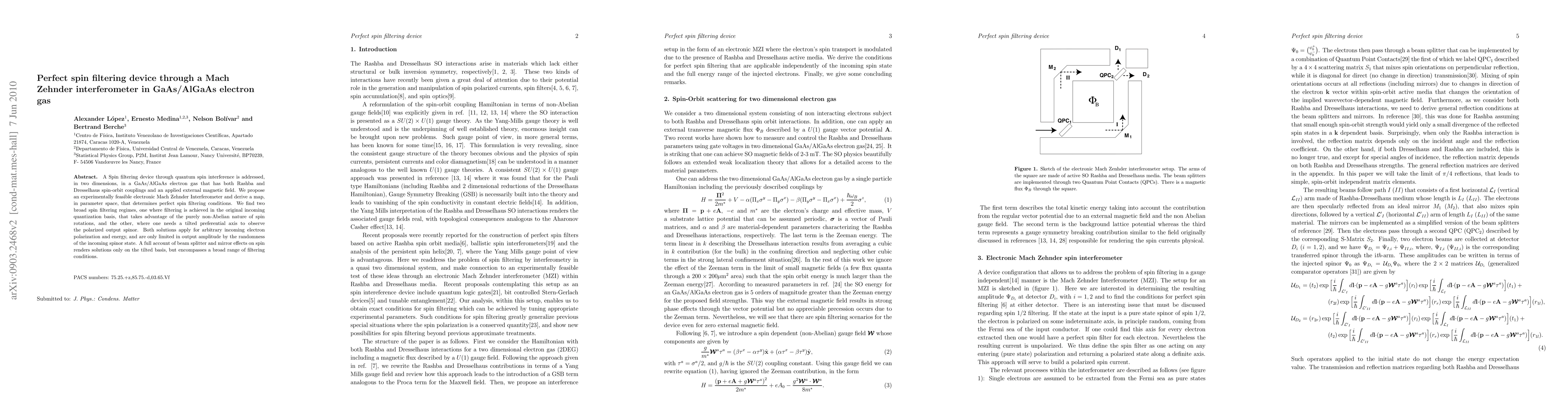 This paper proposes a perfect spin filtering device using a Mach Zehnder interferometer in GaAs/AlGaAs electron gas, addressing spin filtering through quantum spin interference in a medium with both Rashba and Dresselhaus spin-orbit couplings. The study finds two solutions for achieving perfect spin filtering, one based on non-Abelian gauge and the other approximated by an Abelianized method.