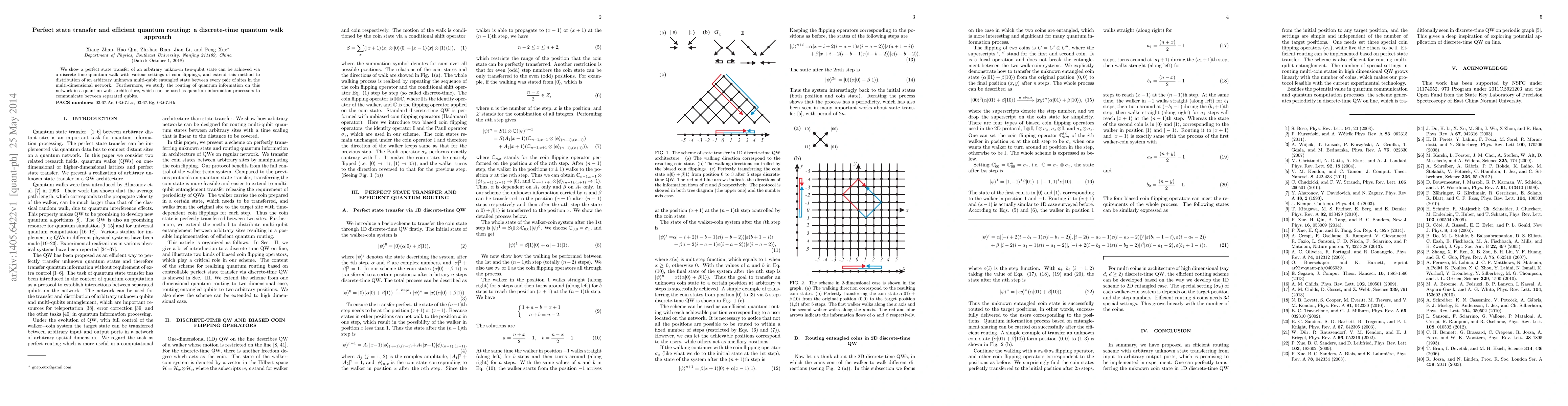 This paper demonstrates perfect state transfer of unknown two-qubit states using discrete-time quantum walks and extends this to multi-qubit entangled states across a network. It also explores quantum routing for efficient communication between separated qubits in a quantum information processor framework.