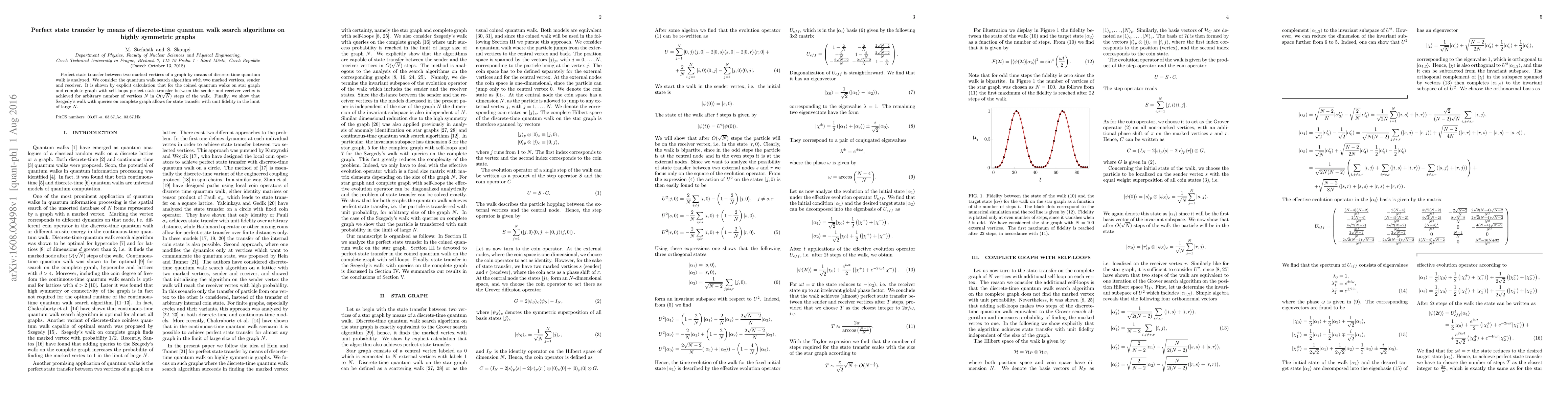 This paper investigates perfect state transfer using discrete-time quantum walks on symmetric graphs, demonstrating that perfect state transfer between two marked vertices is achievable in $O(\sqrt{N})$ steps for star and complete graphs with self-loops, and confirming unit fidelity state transfer for Szegedy's walk on large complete graphs.