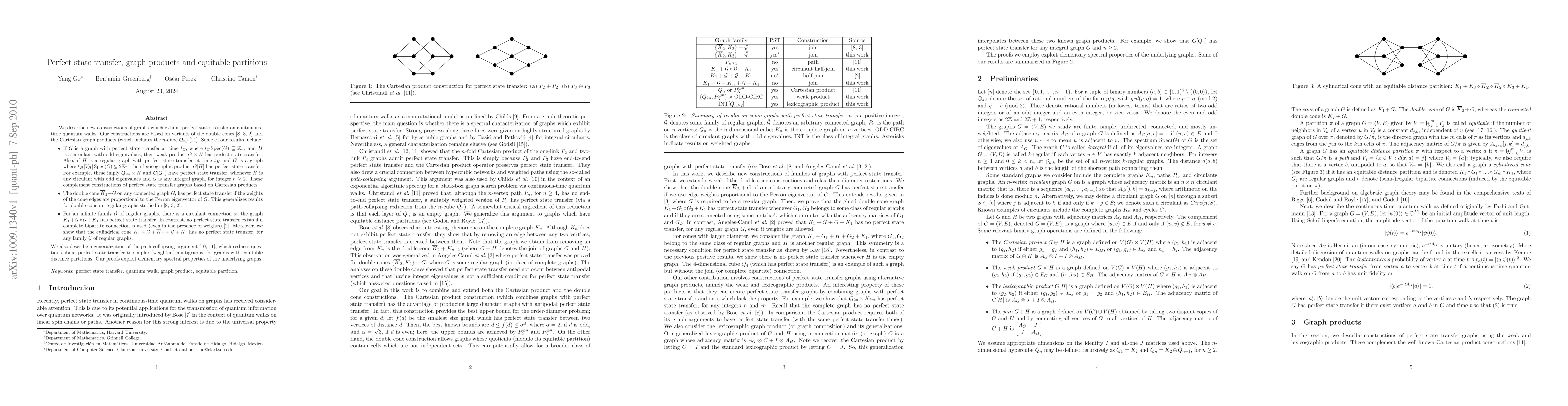We describe new constructions of graphs which exhibit perfect state transfer on continuous-time quantum walks. Our constructions are based on variants of the double cones [BCMS09,ANOPRT10,ANOPRT09] and the Cartesian graph products (which includes the n-cube) [CDDEKL05]. Some of our results include: (1) If $G$ is a graph with perfect state transfer at time $t_{G}$, where $t_{G}\Spec(G) \subseteq \ZZ\pi$, and $H$ is a circulant with odd eigenvalues, their weak product $G \times H$ has perfect state transfer. Also, if $H$ is a regular graph with perfect state transfer at time $t_{H}$ and $G$ is a graph where $t_{H}|V_{H}|\Spec(G) \subseteq 2\ZZ\pi$, their lexicographic product $G[H]$ has perfect state transfer. (2) The double cone $\overline{K}_{2} + G$ on any connected graph $G$, has perfect state transfer if the weights of the cone edges are proportional to the Perron eigenvector of $G$. This generalizes results for double cone on regular graphs studied in [BCMS09,ANOPRT10,ANOPRT09]. (3) For an infinite family $\GG$ of regular graphs, there is a circulant connection so the graph $K_{1}+\GG\circ\GG+K_{1}$ has perfect state transfer. In contrast, no perfect state transfer exists if a complete bipartite connection is used (even in the presence of weights) [ANOPRT09]. We also describe a generalization of the path collapsing argument [CCDFGS03,CDDEKL05], which reduces questions about perfect state transfer to simpler (weighted) multigraphs, for graphs with equitable distance partitions.