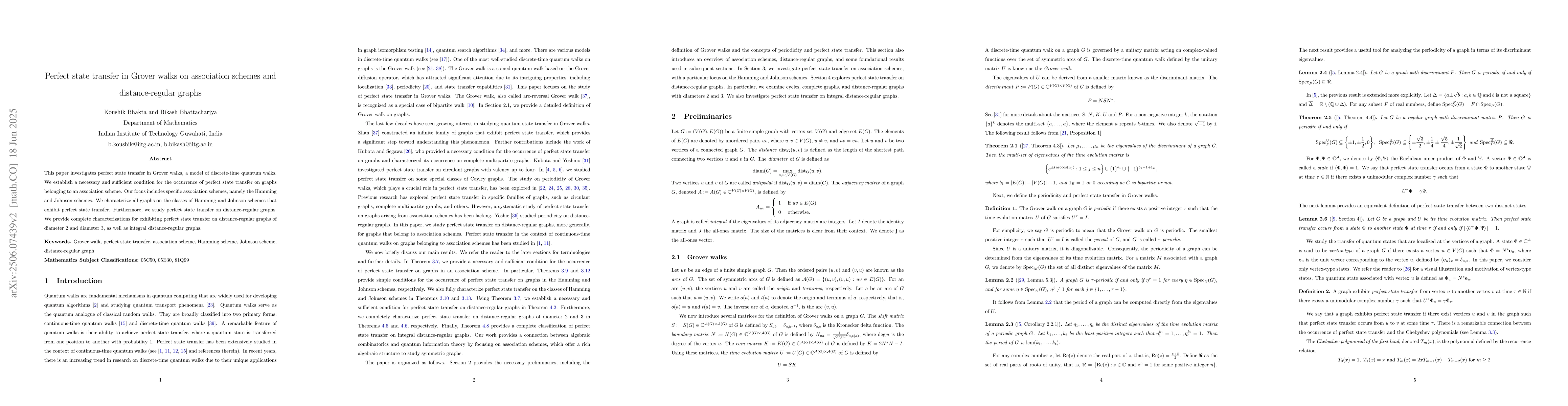 This paper investigates perfect state transfer in Grover walks on specific graph types, including association schemes and distance-regular graphs, providing necessary and sufficient conditions for perfect state transfer.