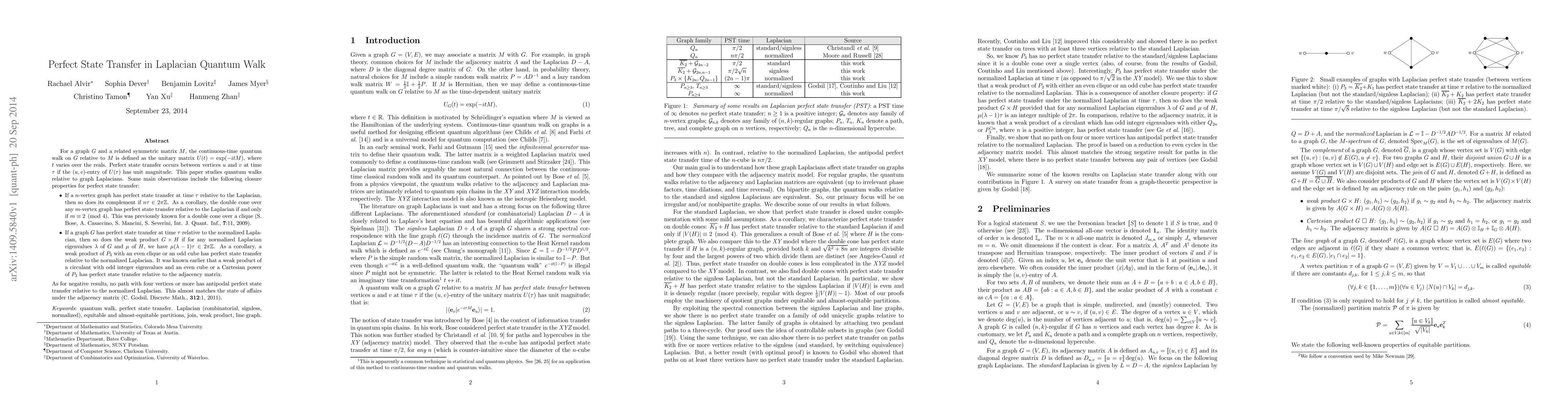 This paper investigates perfect state transfer in continuous-time quantum walks on graphs relative to their Laplacians, revealing closure properties for such transfers. It finds that perfect state transfer is preserved under graph complementation and weak product constructions under specific conditions, but no path with four or more vertices exhibits antipodal perfect state transfer.