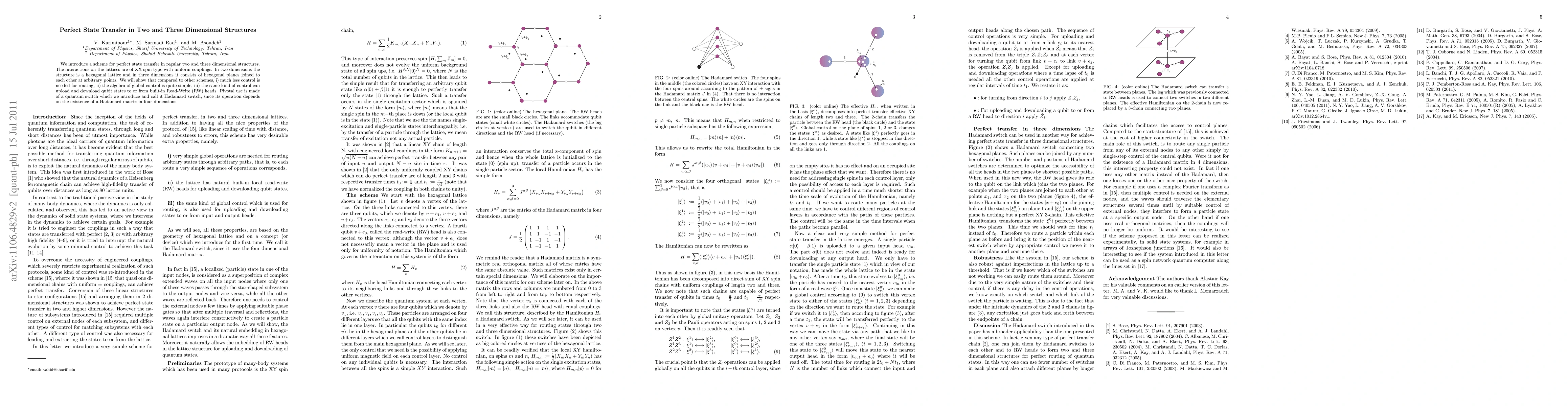 This paper proposes a scheme for perfect state transfer in two and three-dimensional lattice structures using XX spin interactions and uniform couplings. The method requires minimal control, simplifies global control algebra, and enables qubit state transfer via a newly introduced Hadamard switch.