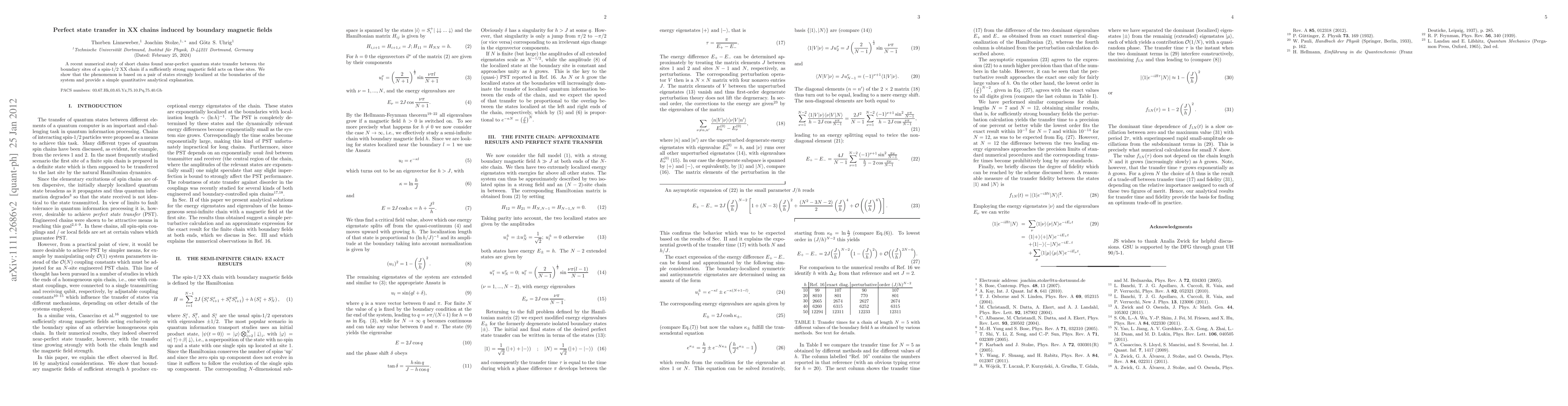 A recent numerical study of short chains found near-perfect quantum state transfer between the boundary sites of a spin-1/2 XX chain if a sufficiently strong magnetic field acts on these sites. We show that the phenomenon is based on a pair of states strongly localized at the boundaries of the system and provide a simple quantitative analytical explanation.