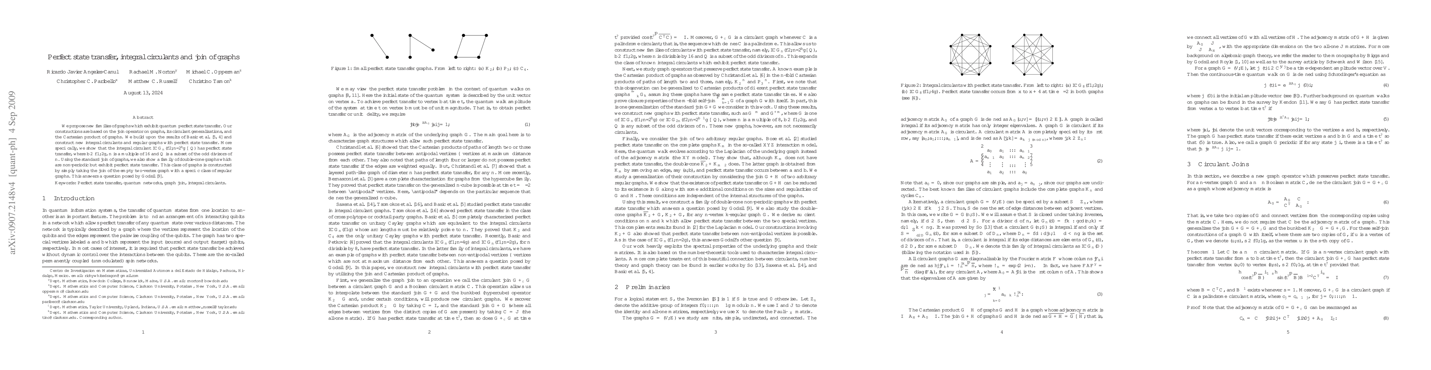 This paper proposes new families of graphs demonstrating quantum perfect state transfer, utilizing the join operator, circulant generalizations, and Cartesian products. It constructs integral circulant graphs and regular graphs with perfect state transfer, specifically showing that $\textsc{ICG}_{n}(\{2,n/2^{b}\} \cup Q)$ achieves perfect state transfer for certain $b$, $n$, and $Q$.