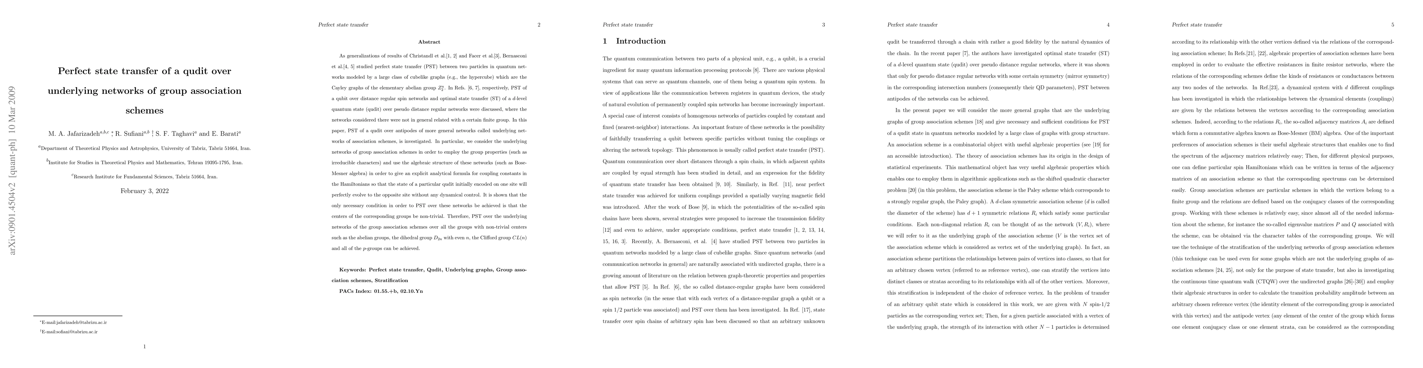 This paper investigates perfect state transfer (PST) of a qudit over networks derived from association schemes, leveraging group properties and algebraic structures. The authors provide an explicit formula for Hamiltonian coupling constants, demonstrating PST is achievable when the centers of the corresponding groups are non-trivial, applicable to various groups including abelian, dihedral, Clifford, and $p$-groups.