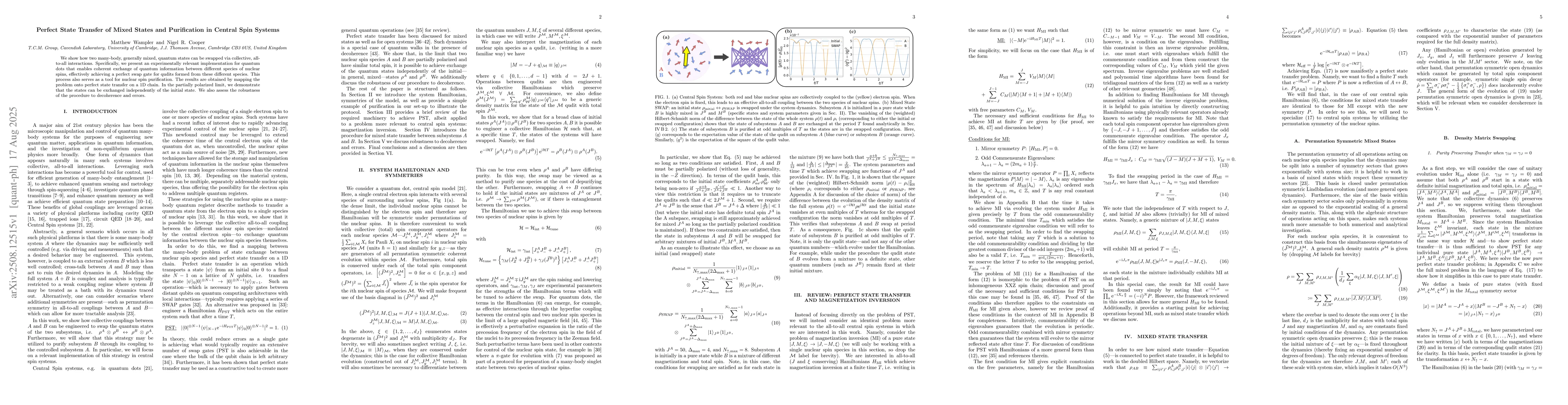 We show how two many-body, generally mixed, quantum states can be swapped via collective, all-to-all interactions. Specifically, we present an experimentally relevant implementation for quantum dots that enables coherent exchange of quantum information between different species of nuclear spins, effectively achieving a perfect swap gate for qudits formed from these different species. This process also serves as a tool for nuclear spin purification. The results are obtained by mapping the problem onto perfect state transfer on a 1D chain. In the partially polarized limit, we demonstrate that the states can be exchanged independently of the initial state. We also assess the robustness of the procedure to decoherence and errors.