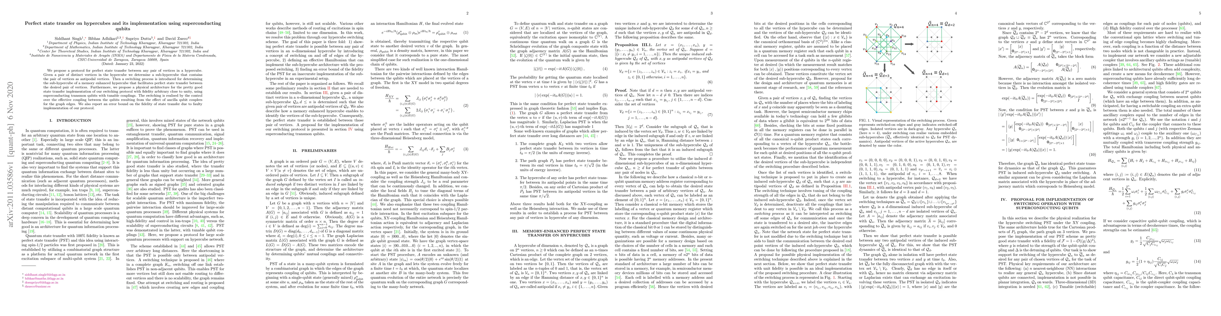 This paper proposes a protocol for perfect state transfer between any pair of vertices in a hypercube, utilizing a sub-hypercube switching process. It also outlines a physical architecture using superconducting transmon qubits to achieve state transfer with high fidelity, detailing error bounds due to potential implementation faults.