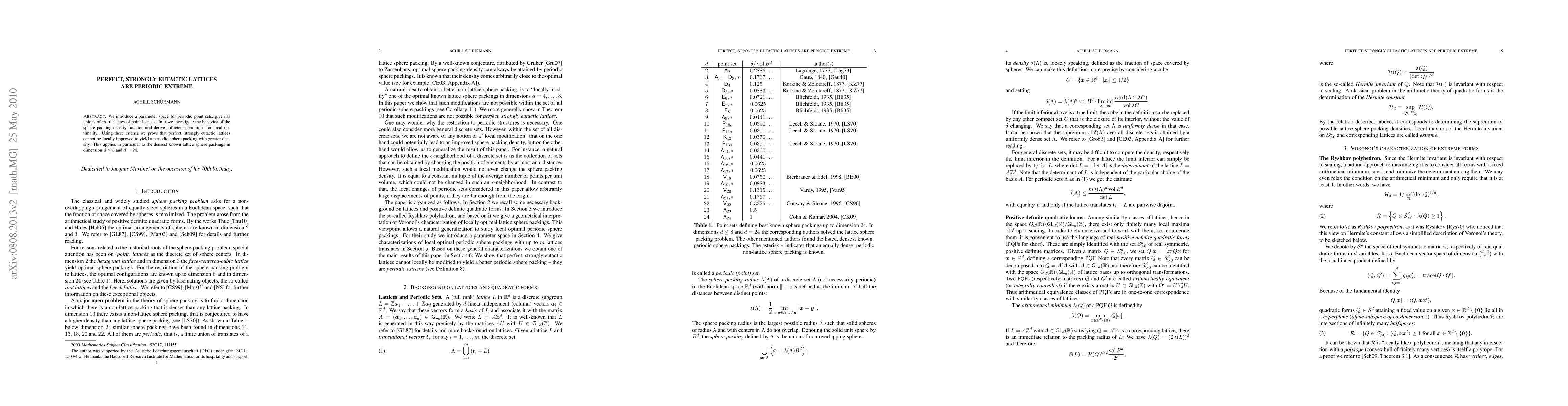 We introduce a parameter space for periodic point sets, given as unions of $m$ translates of point lattices. In it we investigate the behavior of the sphere packing density function and derive sufficient conditions for local optimality. Using these criteria we prove that perfect, strongly eutactic lattices cannot be locally improved to yield a periodic sphere packing with greater density. This applies in particular to the densest known lattice sphere packings in dimension $d\leq 8$ and $d=24$.