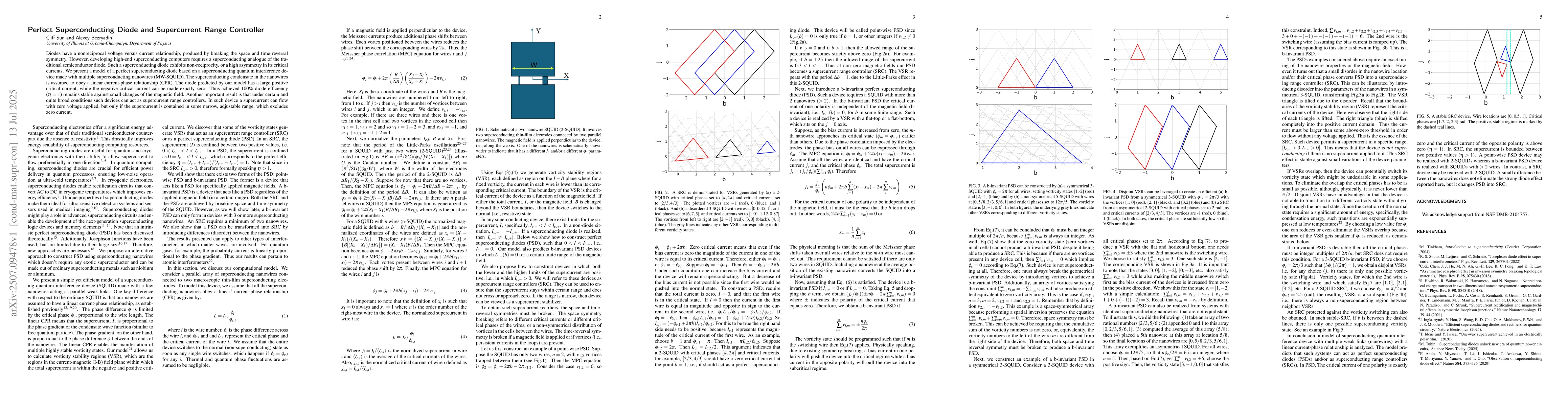 Diodes have a nonreciprocal voltage versus current relationship, produced by breaking the space and time reversal symmetry. However, developing high-end superconducting computers requires a superconducting analogue of the traditional semiconductor diode. Such a superconducting diode exhibits non-reciprocity, or a high asymmetry in its critical currents. We present a model of a perfect superconducting diode based on a superconducting quantum interference device made with multiple superconducting nanowires (MW-SQUID). The superconducting condensate in the nanowires is assumed to obey a linear current-phase relationship (CPR). The diode predicted by our model has a large positive critical current, while the negative critical current can be made exactly zero. Thus achieved 100\% diode efficiency ($\eta = 1$) remains stable against small changes of the magnetic field. Another important result is that under certain and quite broad conditions such devices can act as supercurrent range controllers. In such device a supercurrent can flow with zero voltage applied, but only if the supercurrent is contained in some narrow, adjustable range, which excludes zero current.