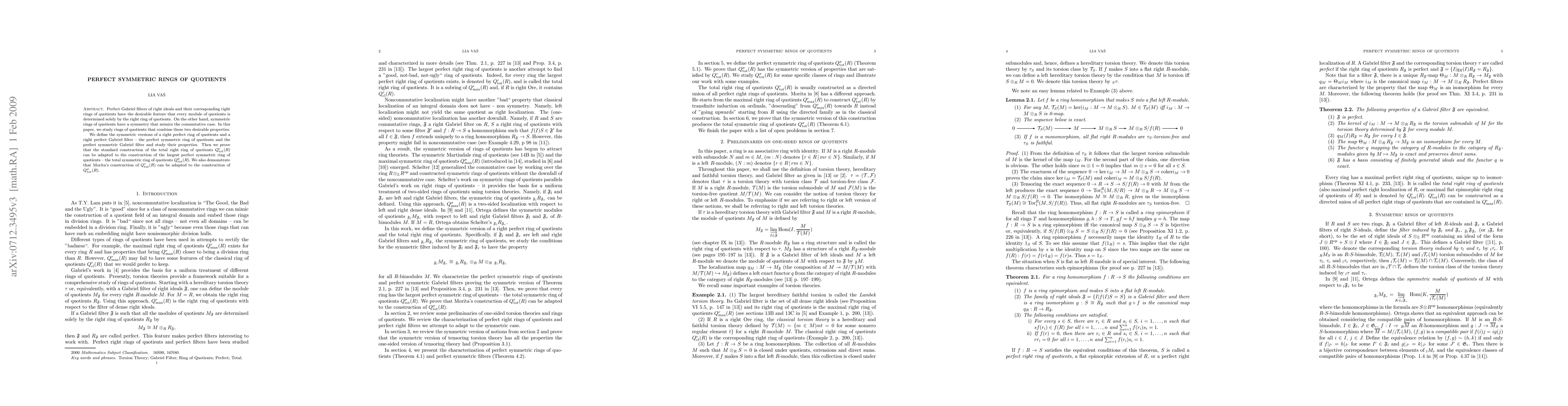 This paper introduces perfect symmetric rings of quotients, combining the properties of perfect Gabriel filters and symmetric rings of quotients. It defines and studies the perfect symmetric ring of quotients and the perfect symmetric Gabriel filter, proving that the total symmetric ring of quotients can be constructed analogously to the total ring of quotients.