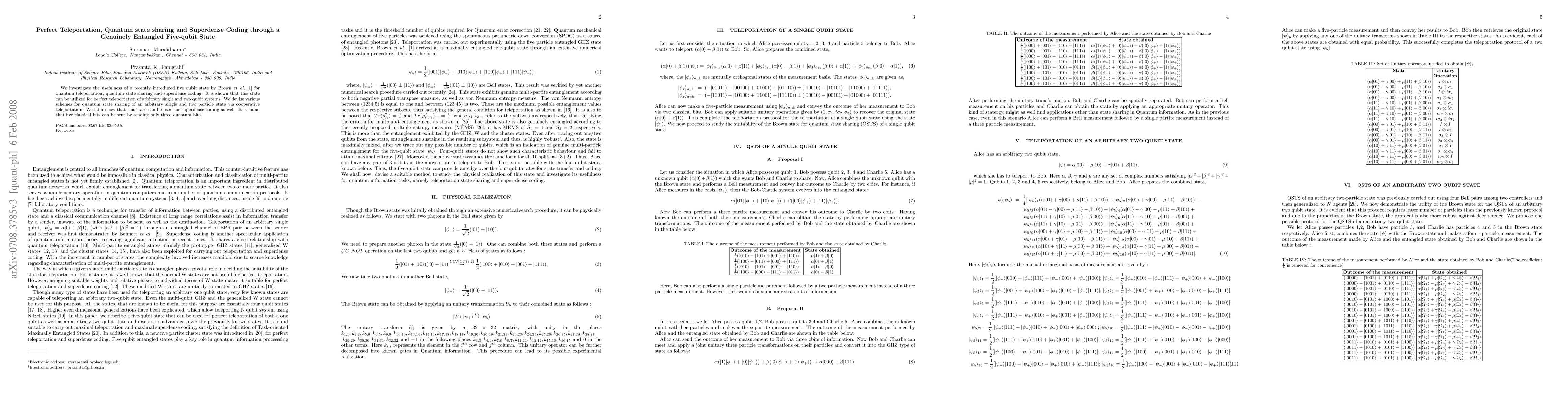 This paper explores the application of a five-qubit entangled state for quantum teleportation, state sharing, and superdense coding. The study demonstrates perfect teleportation and efficient quantum state sharing using this state, achieving the transmission of five classical bits via just three quantum bits.