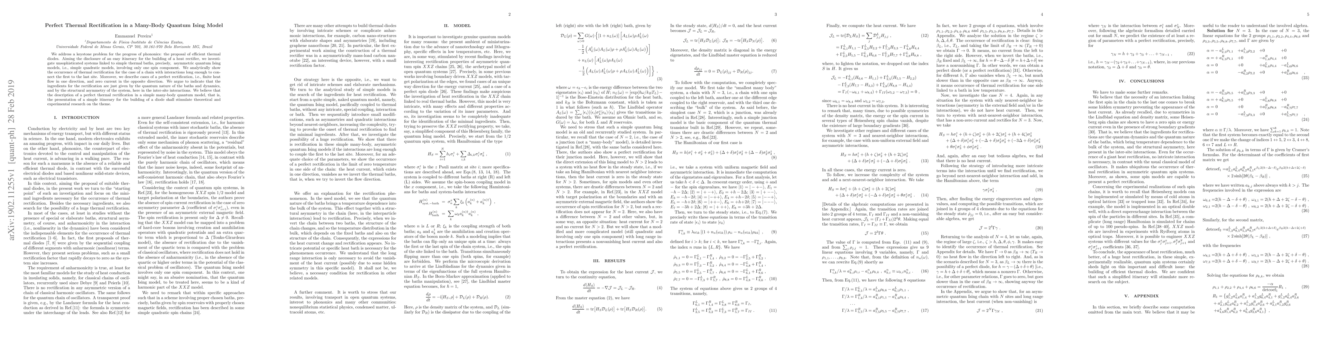 This paper proposes a simple many-body quantum Ising model to demonstrate perfect thermal rectification, showing finite heat flow in one direction and zero in the opposite. The authors argue that the quantum nature of the baths and structural asymmetry in the system's interactions are key to this phenomenon.