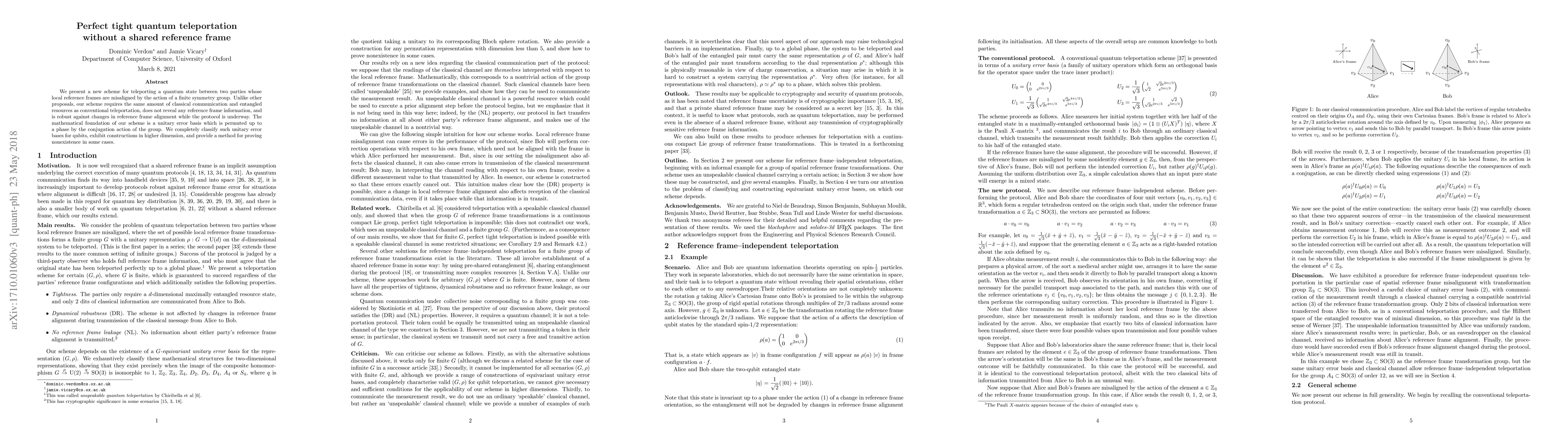 We present a new scheme for teleporting a quantum state between two parties whose local reference frames are misaligned by the action of a finite symmetry group. Unlike other proposals, our scheme requires the same amount of classical communication and entangled resources as conventional teleportation, does not reveal any reference frame information, and is robust against changes in reference frame alignment while the protocol is underway. The mathematical foundation of our scheme is a unitary error basis which is permuted up to a phase by the conjugation action of the group. We completely classify such unitary error bases for qubits, exhibit constructions in higher dimension, and provide a method for proving nonexistence in some cases.