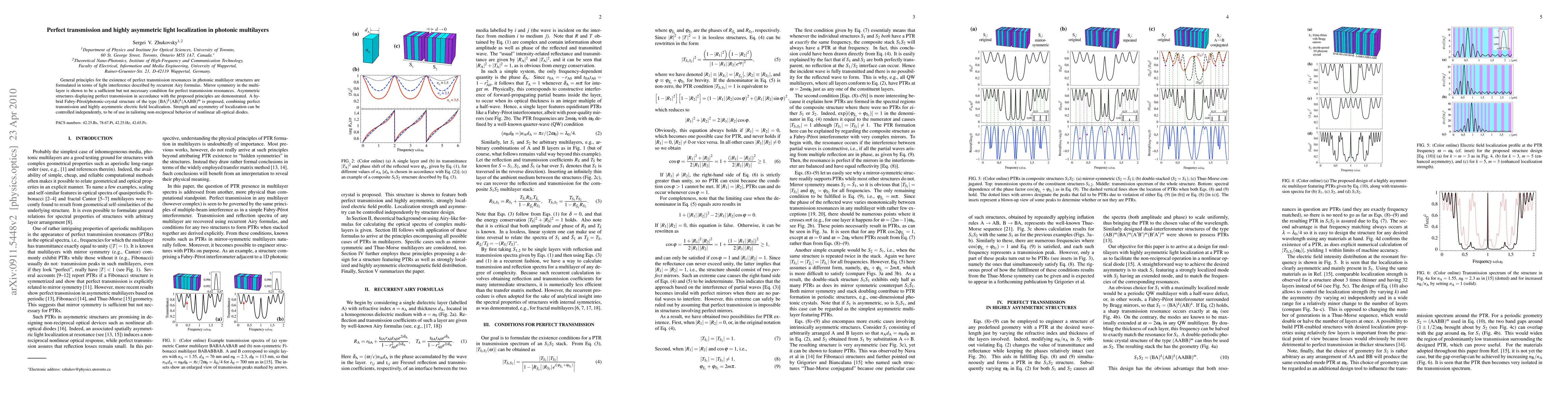 This paper formulates principles for perfect transmission in photonic multilayers using recurrent Airy formulas and demonstrates that mirror symmetry is not essential for such resonances. It proposes a hybrid structure combining perfect transmission and asymmetric electric field localization, useful for designing nonlinear all-optical diodes.