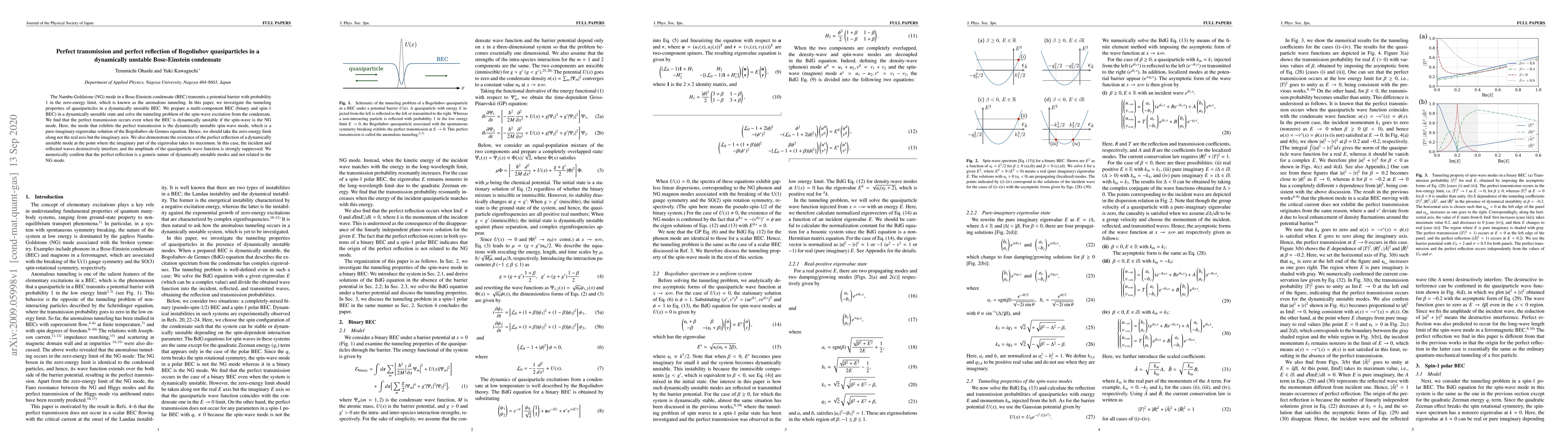 This paper investigates the tunneling properties of Bogoliubov quasiparticles in a dynamically unstable Bose-Einstein condensate (BEC), finding perfect transmission and reflection of the Nambu-Goldstone mode and dynamically unstable spin-wave modes, respectively, under specific conditions. Perfect reflection occurs when the imaginary part of the eigenvalue reaches its maximum, leading to destructive interference.