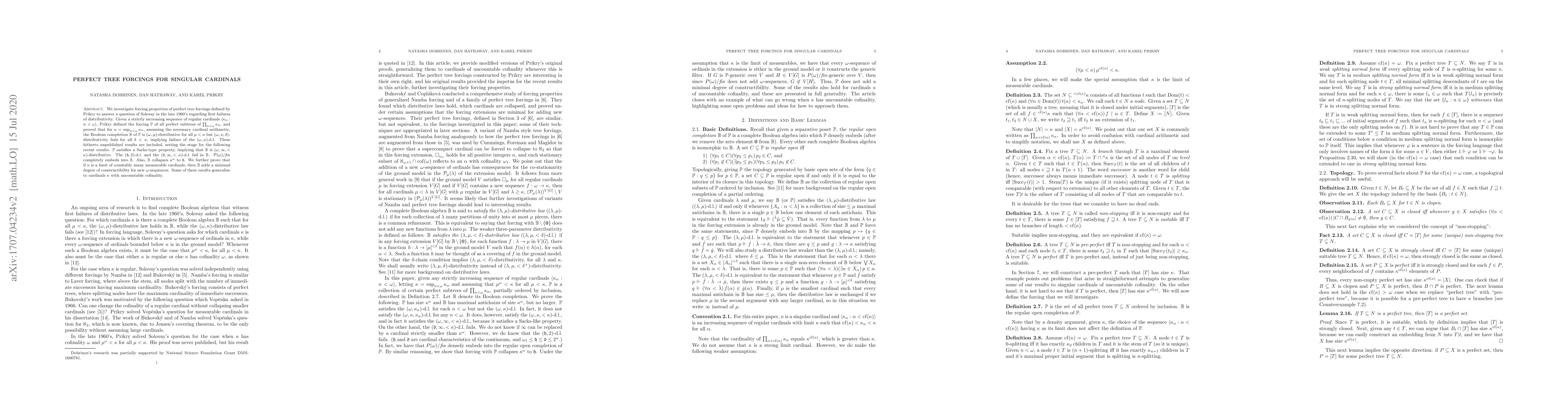 We investigate forcing properties of perfect tree forcings defined by Prikry to answer a question of Solovay in the late 1960's regarding first failures of distributivity. Given a strictly increasing sequence of regular cardinals $\langle \kappa_n: n< \omega \rangle$, Prikry defined the forcing $\mathbb{P}$ all perfect subtrees of $\prod_{n<\omega}\kappa_n$, and proved that for $\kappa=\sup_{n<\omega}\kappa_n$, assuming the necessary cardinal arithmetic, the Boolean completion $\mathbb{B}$ of $\mathbb{P}$ is $(\omega,\mu)$-distributive for all $\mu<\kappa$ but $(\omega,\kappa,\delta)$-distributivity fails for all $\delta<\kappa$, implying failure of the $(\omega,\kappa)$-d.l. These hitherto unpublished results are included, setting the stage for the following recent results. $\mathbb{P}$ satisfies a Sacks-type property, implying that $\mathbb{B}$ is $(\omega,\infty,<\kappa)$-distributive. The $(\mathfrak{h},2)$-d.l. and the $(\mathfrak{d},\infty,<\kappa)$-d.l. fail in $\mathbb{B}$. $\mathcal{P}(\omega)/\mbox{Fin}$ completely embeds into $\mathbb{B}$. Also, $\mathbb{B}$ collapses $\kappa^\omega$ to $\mathfrak{h}$. We further prove that if $\kappa$ is a limit of countably many measurable cardinals, then $\mathbb{B}$ adds a minimal degree of constructibility for new $\omega$-sequences. Some of these results generalize to cardinals $\kappa$ with uncountable cofinality.