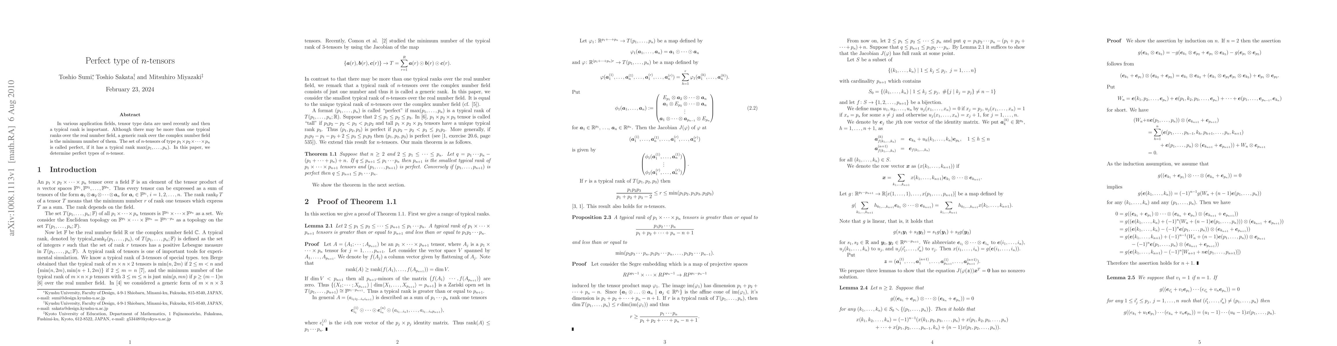 This paper investigates the concept of perfect $n$-tensors, defined as those with a typical rank equal to the maximum of their dimensions. It determines the perfect types of $n$-tensors by analyzing their rank properties over complex number fields.