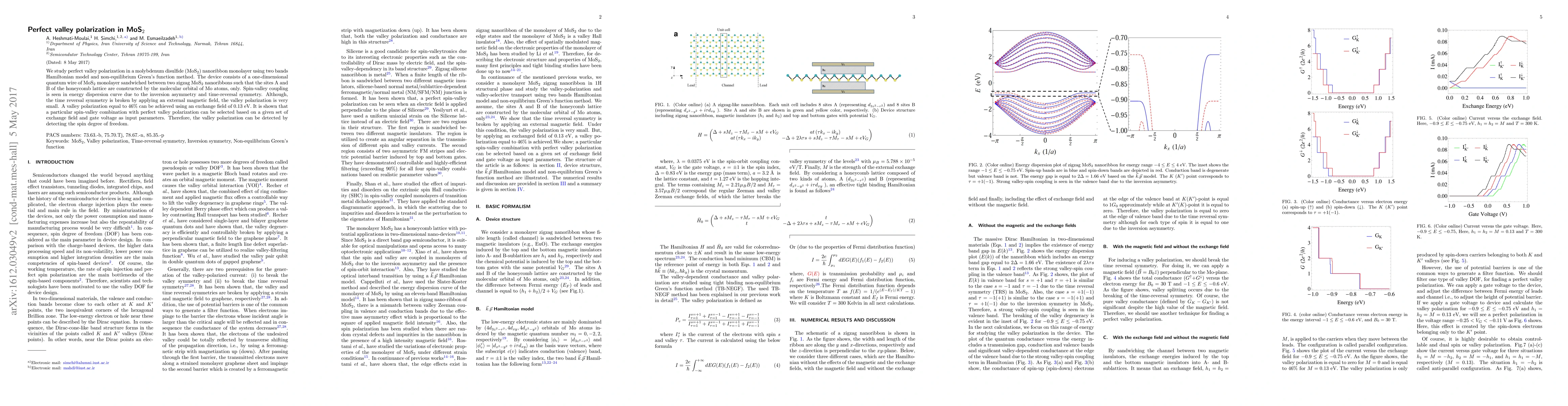 This study investigates the perfect valley polarization in a MoS2 monolayer nanoribbon using a two-band Hamiltonian model and non-equilibrium Green's function method. An exchange field of 0.13 eV can achieve 46% valley polarization, with perfect polarization selectable via specific exchange fields and gate voltages, detectable through spin degree freedom.