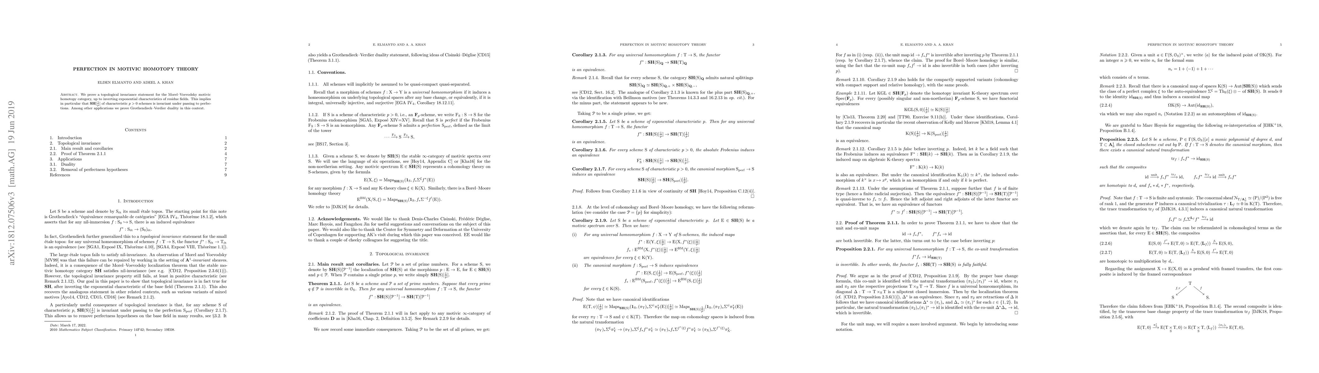 We prove a topological invariance statement for the Morel-Voevodsky motivic homotopy category, up to inverting exponential characteristics of residue fields. This implies in particular that SH[1/p] of characteristic p>0 schemes is invariant under passing to perfections. Among other applications we prove Grothendieck-Verdier duality in this context.