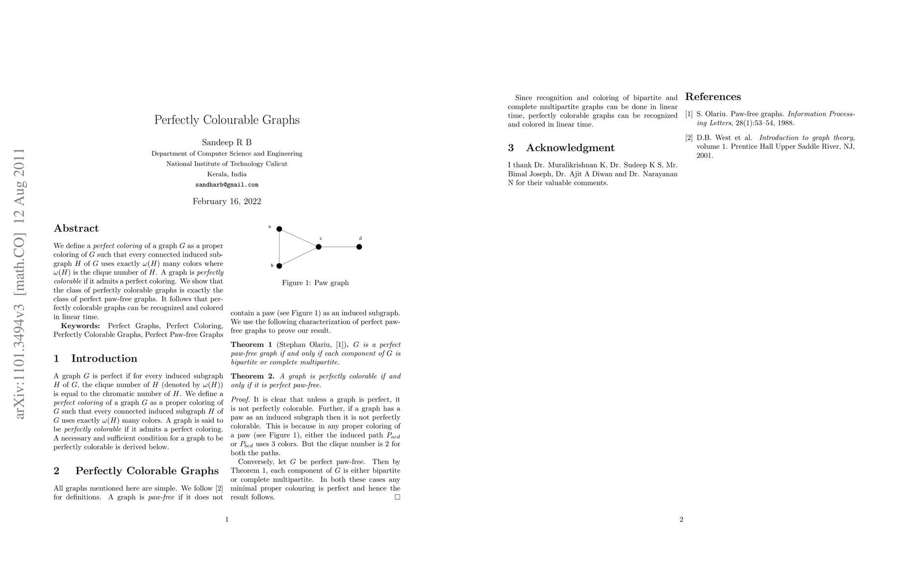This paper defines perfect colorings for graphs, where every induced subgraph uses exactly its clique number of colors. It concludes that perfectly colorable graphs are equivalent to perfect paw-free graphs and can be recognized and colored in linear time.