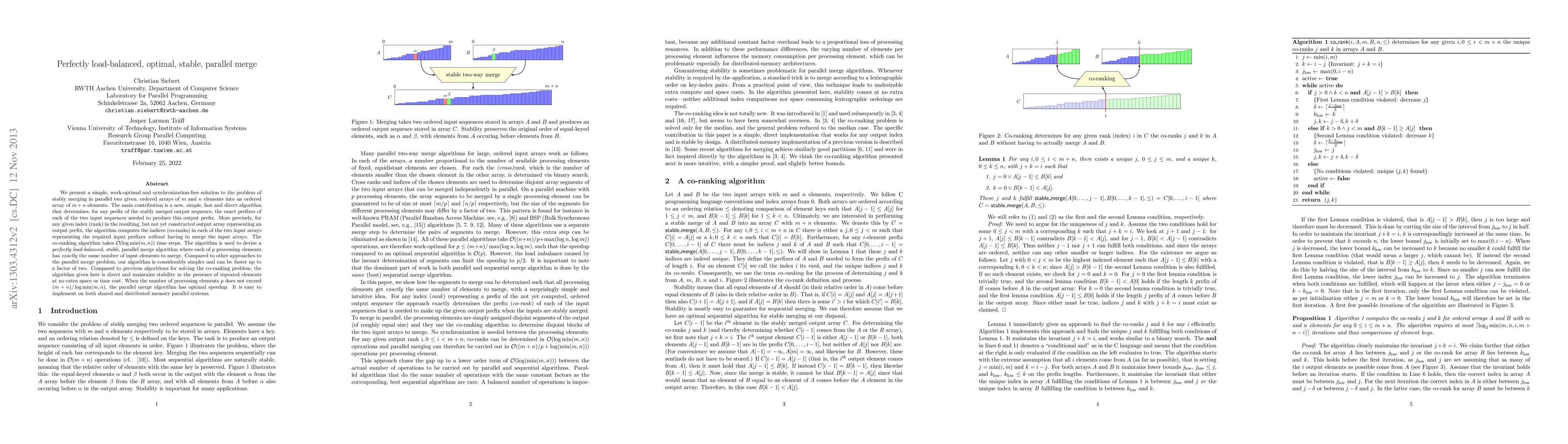 This paper introduces a new, simple, and efficient algorithm for parallel merging of two ordered arrays, achieving optimal load-balancing and stability without synchronization. The algorithm determines required input prefixes in O(log min(m,n)) time, enabling a faster and simpler parallel merge process with optimal speedup when the number of processors is appropriately chosen.