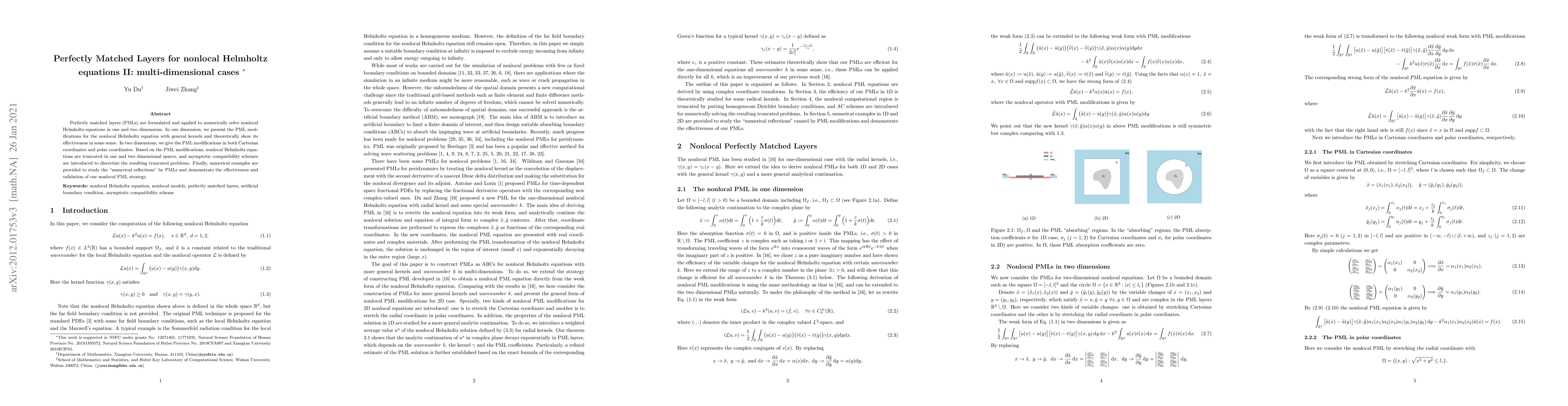 This paper formulates and applies perfectly matched layers (PMLs) to solve nonlocal Helmholtz equations in one and two dimensions, presenting modifications for both Cartesian and polar coordinates. Numerical examples validate the effectiveness of the PML strategy in mitigating "numerical reflections."