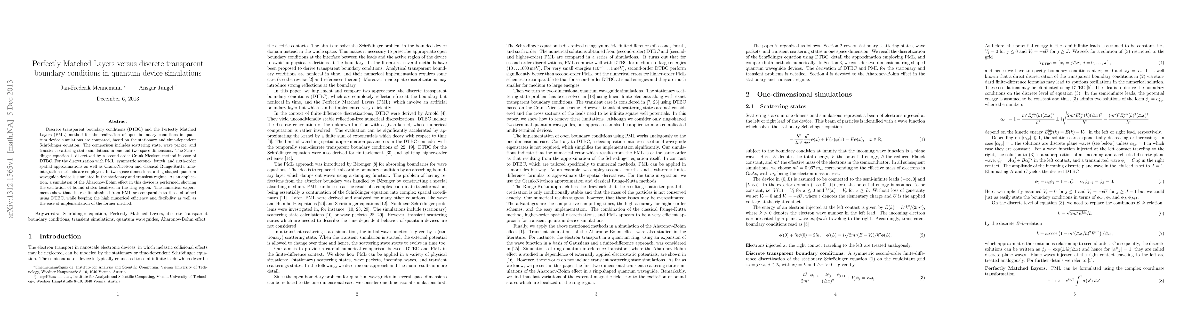This paper compares the Perfectly Matched Layers (PML) method with Discrete Transparent Boundary Conditions (DTBC) for open boundary simulations in quantum devices, finding both methods yield comparable results while PML offers higher efficiency and flexibility. Simulations include scattering states, wave packets, and transient scattering in one and two dimensions, with an application to the Aharonov-Bohm effect in a ring-shaped quantum waveguide.