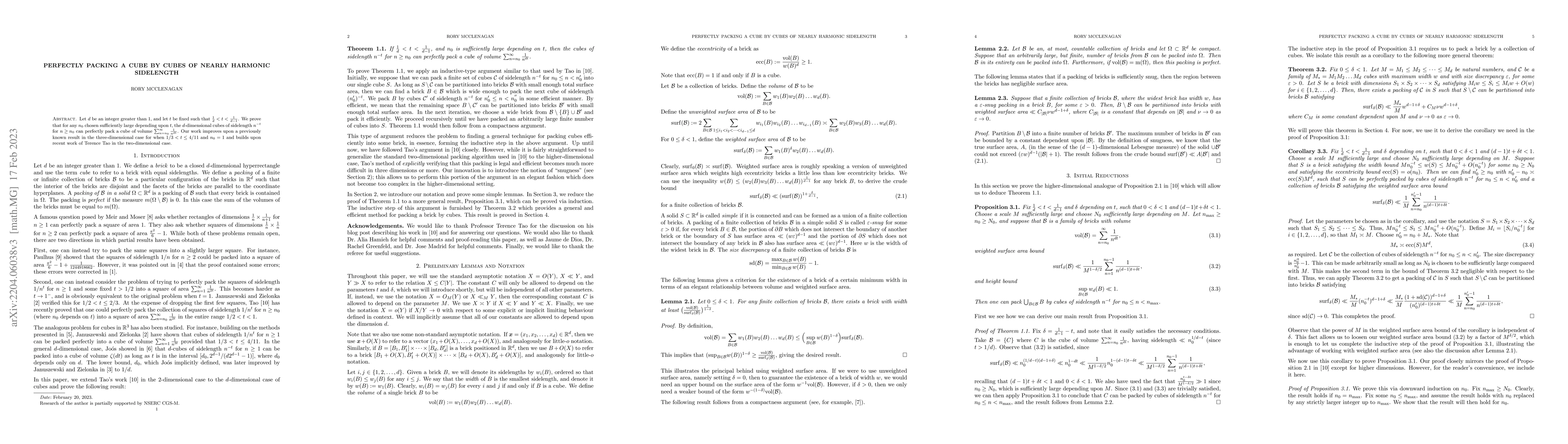 This paper proves that cubes with sidelengths $n^{-t}$ can perfectly pack a larger cube when $t$ is between $1/d$ and $1/(d-1)$ for sufficiently large $n_0$, improving previous results in three dimensions and extending Terence Tao's work on two-dimensional packing.