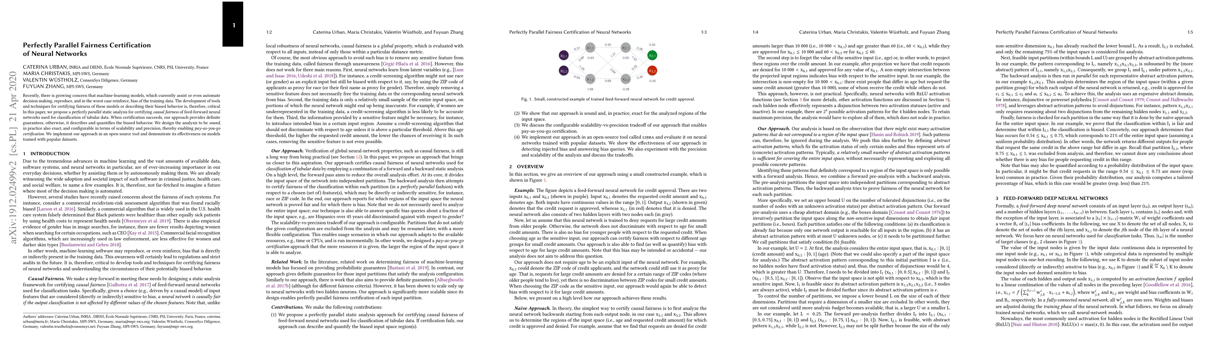This paper proposes a perfectly parallel static analysis tool for certifying causal fairness in feed-forward neural networks used for classification. The method provides definite fairness guarantees when successful, otherwise it quantifies biased behavior, and is designed to be sound, scalable, and precise.