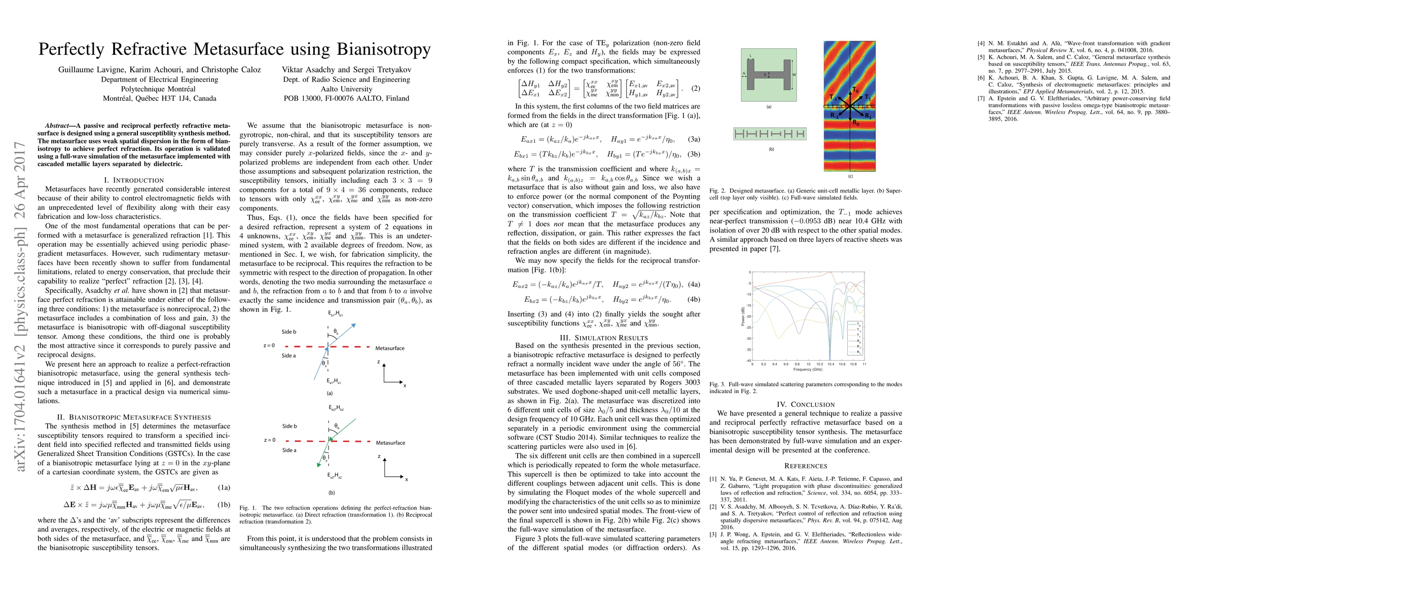 The research presents a general method for synthesizing bianisotropic susceptibility tensors, which can be used to design perfectly refractive metasurfaces.