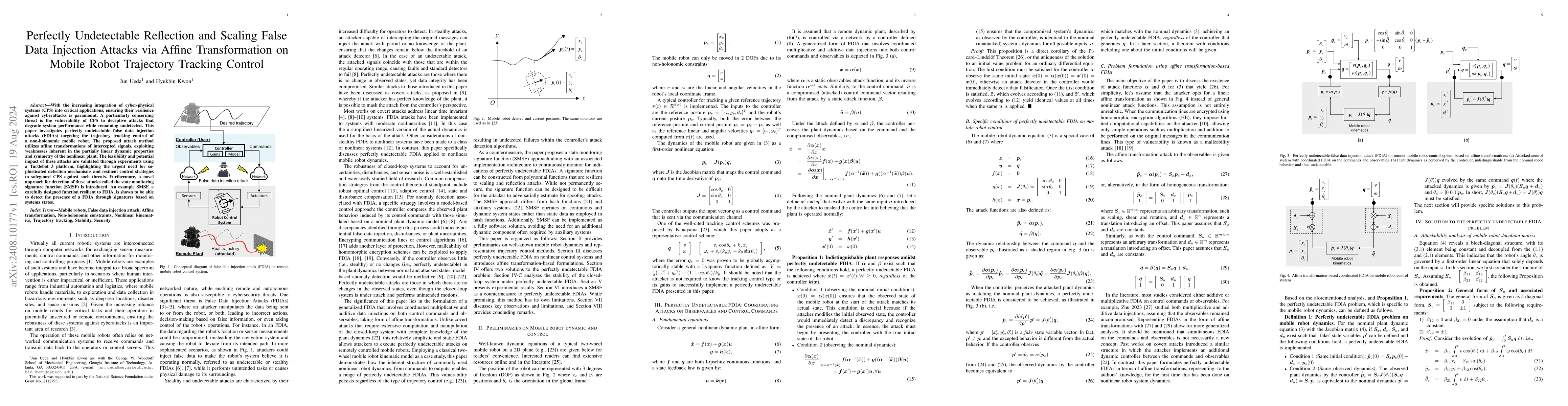With the increasing integration of cyber-physical systems (CPS) into critical applications, ensuring their resilience against cyberattacks is paramount. A particularly concerning threat is the vulnerability of CPS to deceptive attacks that degrade system performance while remaining undetected. This paper investigates perfectly undetectable false data injection attacks (FDIAs) targeting the trajectory tracking control of a non-holonomic mobile robot. The proposed attack method utilizes affine transformations of intercepted signals, exploiting weaknesses inherent in the partially linear dynamic properties and symmetry of the nonlinear plant. The feasibility and potential impact of these attacks are validated through experiments using a Turtlebot 3 platform, highlighting the urgent need for sophisticated detection mechanisms and resilient control strategies to safeguard CPS against such threats. Furthermore, a novel approach for detection of these attacks called the state monitoring signature function (SMSF) is introduced. An example SMSF, a carefully designed function resilient to FDIA, is shown to be able to detect the presence of a FDIA through signatures based on systems states.