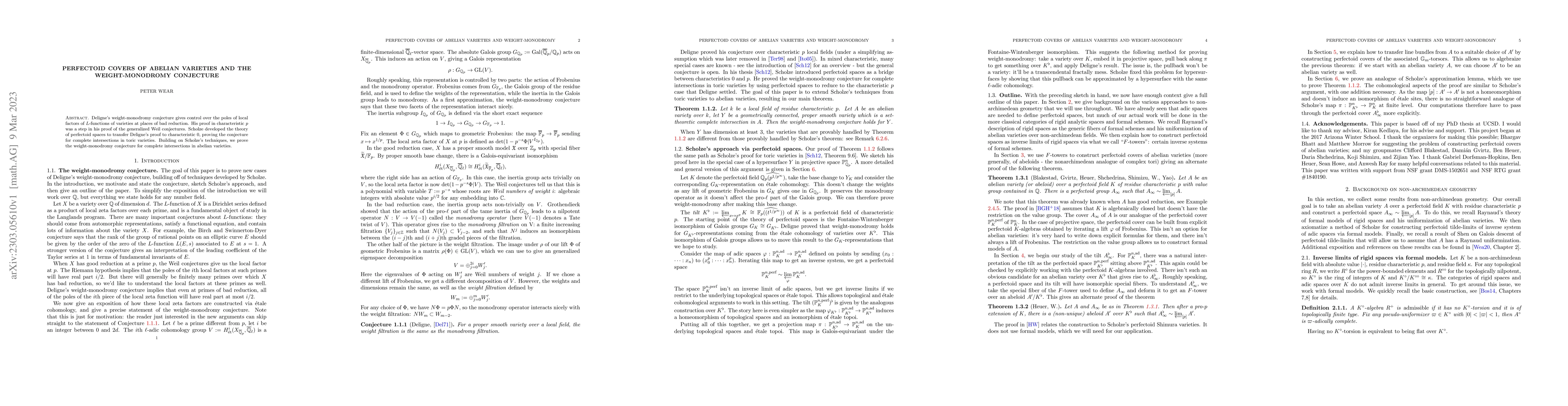 This paper proves the weight-monodromy conjecture for complete intersections in abelian varieties, leveraging Scholze's theory of perfectoid spaces to extend Deligne's original proof from characteristic p to characteristic 0. This advancement builds on Scholze's foundational work in perfectoid covers.