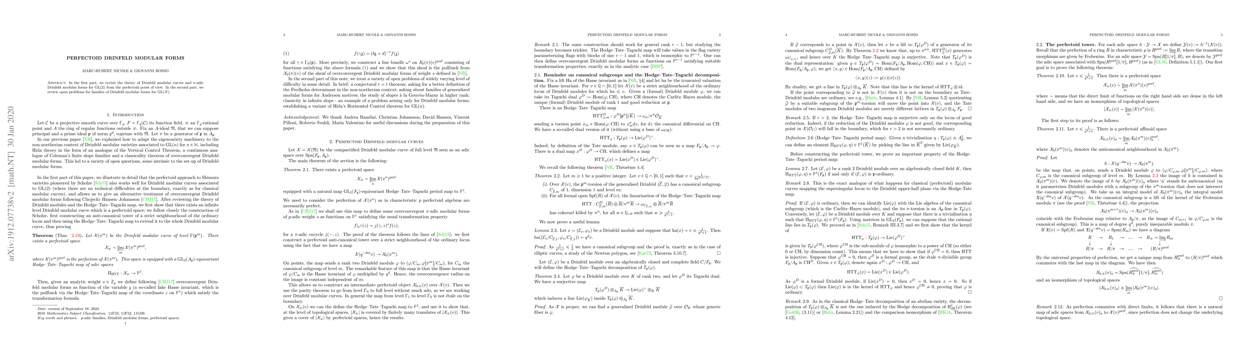 This paper explores Drinfeld modular forms through the lens of perfectoid spaces, reviewing $\pi$-adic forms for GL(2) and highlighting open problems regarding families of modular forms for GL(n). The work aims to integrate perfectoid geometry into the study of Drinfeld modules.