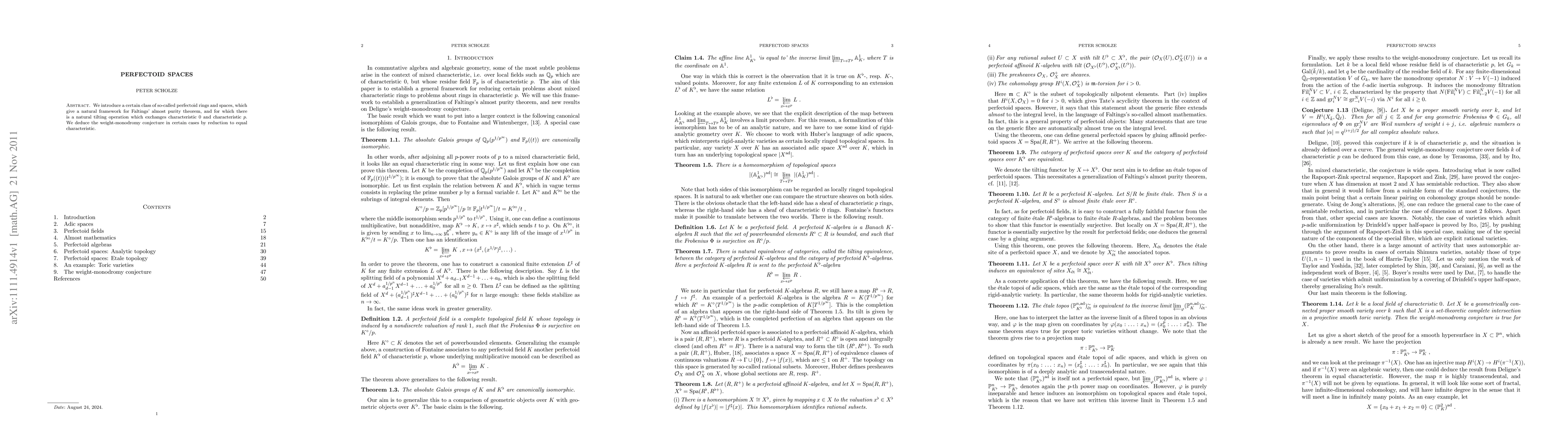Summary: This paper introduces perfectoid rings and spaces, providing a framework for Faltings' almost purity theorem and allowing a tilting operation to switch between characteristics 0 and p, ultimately supporting the weight-monodromy conjecture in specific cases through equal characteristic reduction.