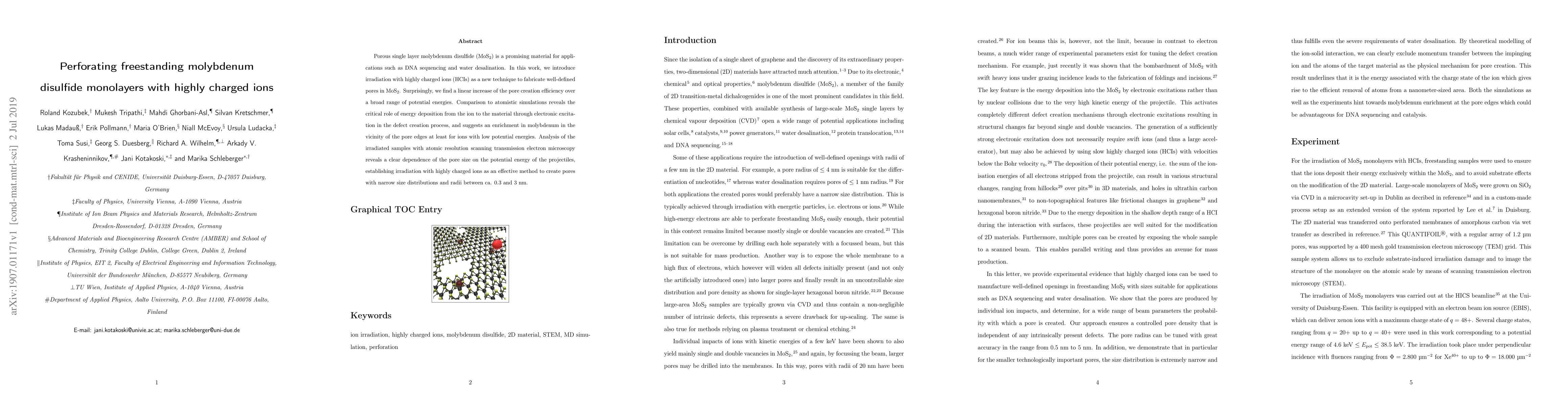 This paper introduces a novel technique using highly charged ions to create well-defined pores in single-layer molybdenum disulfide (MoS$_2$), demonstrating a linear increase in pore efficiency across a range of potential energies. The study highlights the importance of electronic excitation in the defect creation process and establishes this method as effective for producing pores with controlled sizes.