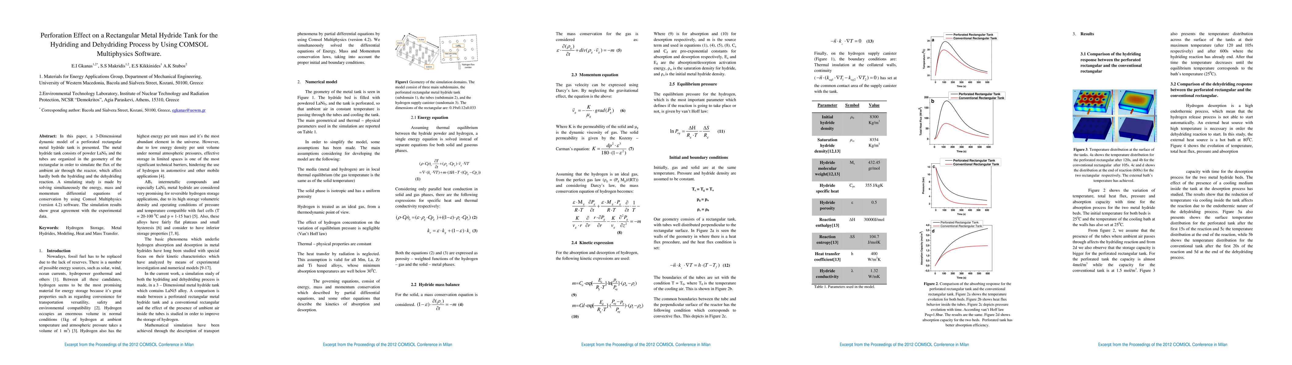 In this paper, a 3 Dimensional dynamic model of a perforated rectangular metal hydride tank is presented. The metal hydride tank consists of powder LaNi5 and the tubes are organized in the geometry of the rectangular in order to simulate the flux of the ambient air through the reactor, which affect hardly both the hydriding and the dehydriding reaction. A simulating study is made by solving simultaneously the energy, mass and momentum differential equations of conservation by using Comsol Multiphysics (version 4.2) software. The simulation results show great agreement with the experimental data.