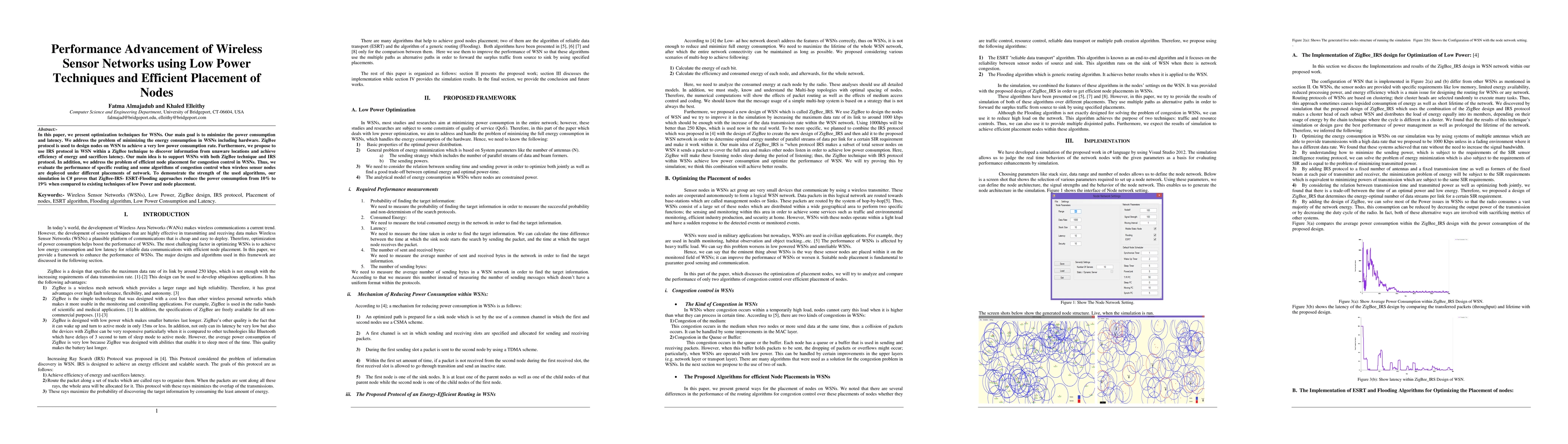 In this paper, we present optimization techniques for WSNs. Our main goal is to minimize the power consumption and latency. We address the problem of minimizing the energy consumption in WSNs including hardware. ZigBee protocol is used to design nodes on WSN to achieve a very low power consumption rate. Furthermore, we propose to use IRS protocol in WSN within a ZigBee technique to discover information from unaware locations and achieve efficiency of energy and sacrifices latency. Our main idea is to support WSNs with both ZigBee technique and IRS protocol. In addition, we address the problem of efficient node placement for congestion control in WSNs. Thus, we evaluate the performance of specific routing and some algorithms of congestion control when wireless sensor nodes are deployed under different placements of network. To demonstrate the strength of the used algorithms, our simulation in C# proves that ZigBee-IRS- ESRT-Flooding approaches reduce the power consumption from 10% to 19% when compared to existing techniques of low Power and node placement.