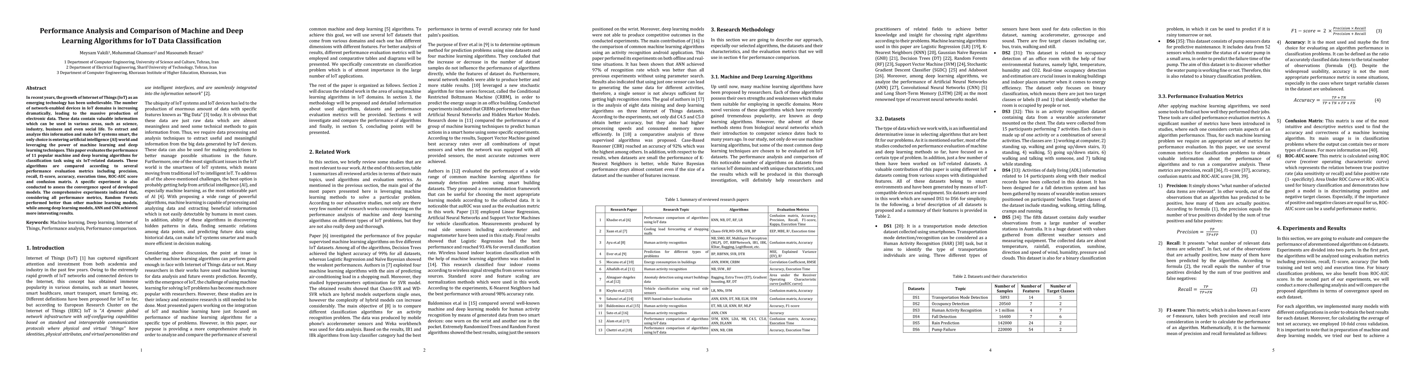 The paper evaluates 11 machine and deep learning algorithms for IoT data classification using six datasets, comparing their performance based on metrics like precision, recall, f1-score, accuracy, execution time, ROC-AUC score, and confusion matrix.