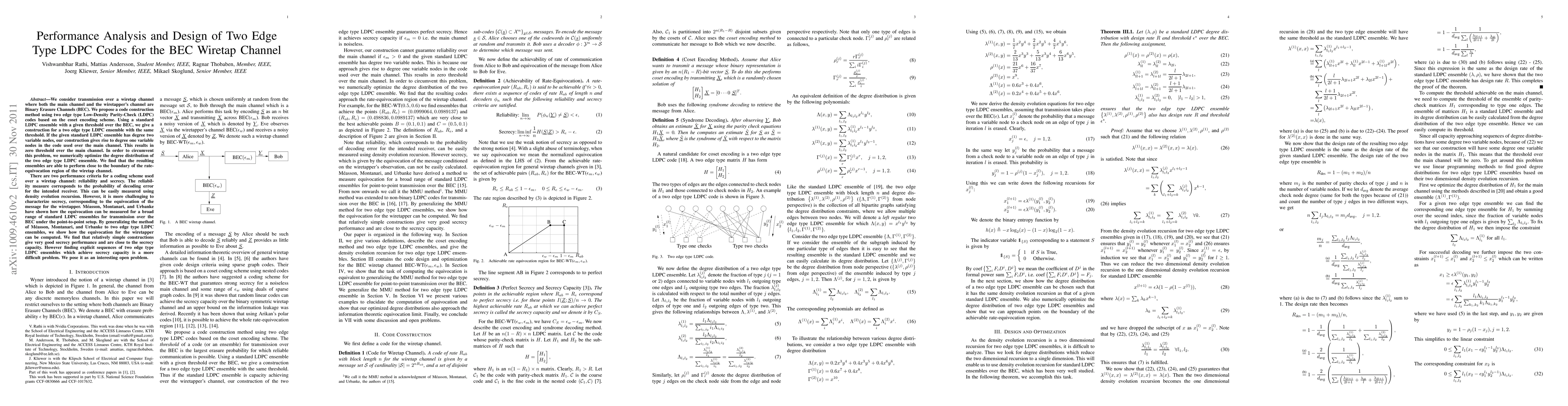 We consider transmission over a wiretap channel where both the main channel and the wiretapper's channel are Binary Erasure Channels (BEC). We propose a code construction method using two edge type LDPC codes based on the coset encoding scheme. Using a standard LDPC ensemble with a given threshold over the BEC, we give a construction for a two edge type LDPC ensemble with the same threshold. If the given standard LDPC ensemble has degree two variable nodes, our construction gives rise to degree one variable nodes in the code used over the main channel. This results in zero threshold over the main channel. In order to circumvent this problem, we numerically optimize the degree distribution of the two edge type LDPC ensemble. We find that the resulting ensembles are able to perform close to the boundary of the rate-equivocation region of the wiretap channel. There are two performance criteria for a coding scheme used over a wiretap channel: reliability and secrecy. The reliability measure corresponds to the probability of decoding error for the intended receiver. This can be easily measured using density evolution recursion. However, it is more challenging to characterize secrecy, corresponding to the equivocation of the message for the wiretapper. M\'easson, Montanari, and Urbanke have shown how the equivocation can be measured for a broad range of standard LDPC ensembles for transmission over the BEC under the point-to-point setup. By generalizing the method of M\'easson, Montanari, and Urbanke to two edge type LDPC ensembles, we show how the equivocation for the wiretapper can be computed. We find that relatively simple constructions give very good secrecy performance and are close to the secrecy capacity. However finding explicit sequences of two edge type LDPC ensembles which achieve secrecy capacity is a more difficult problem. We pose it as an interesting open problem.